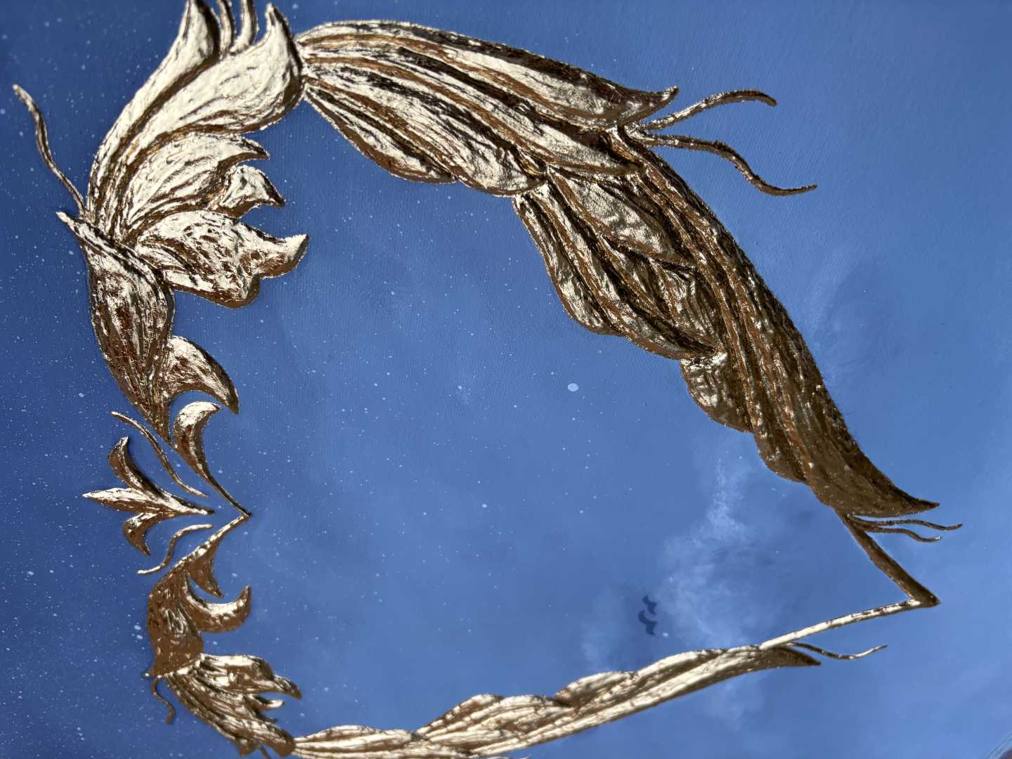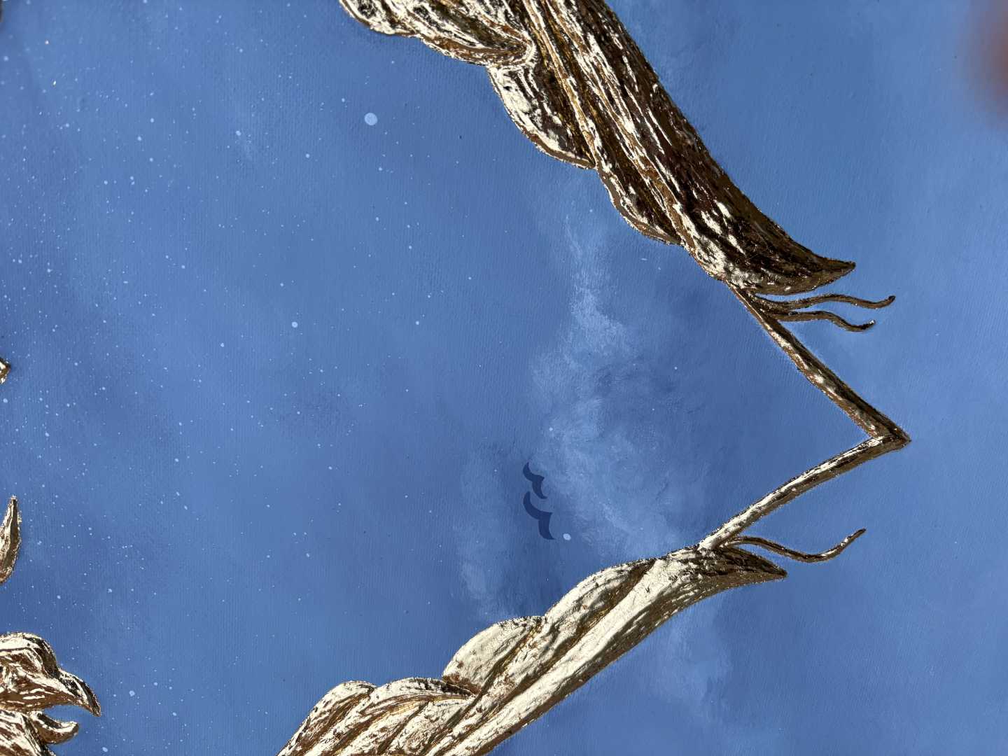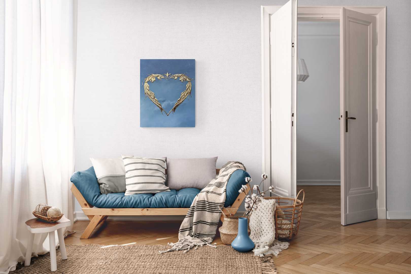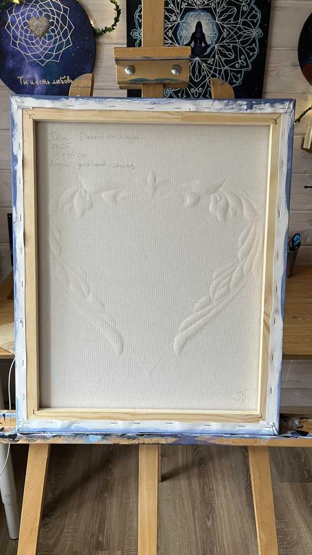 Сердце выполнено из текстурной пасты с использованием золотистой потали, создающая сияющий акцент на фоне спокойного градиента от глубокого синего к мягким небесным оттенкам. Символические детали, лёгкие облака и маленькие силуэты птиц добавляют ощущение лёгкости, простора и внутреннего пространства, приглашая к тихому созерцанию.