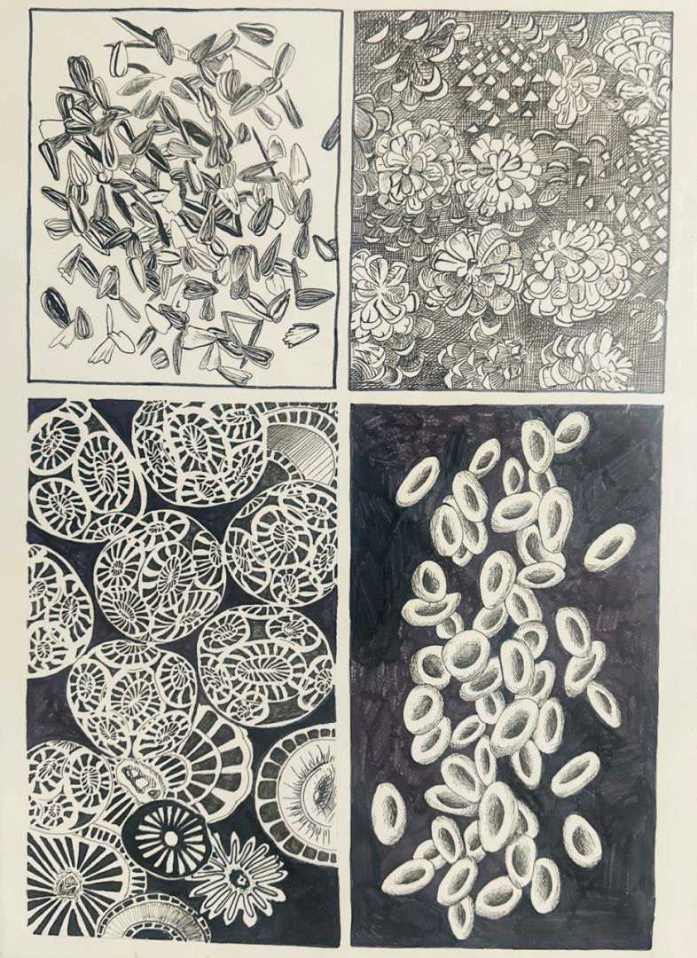 Картина представляет собой графическую композицию, разделённую на четыре части, каждая из которых исследует форму и ритм природных элементов. В верхних фрагментах изображены семена и цветочные мотивы, выполненные тонкой линией и штриховкой, создающей ощущение движения и фактуры. Нижние части наполне