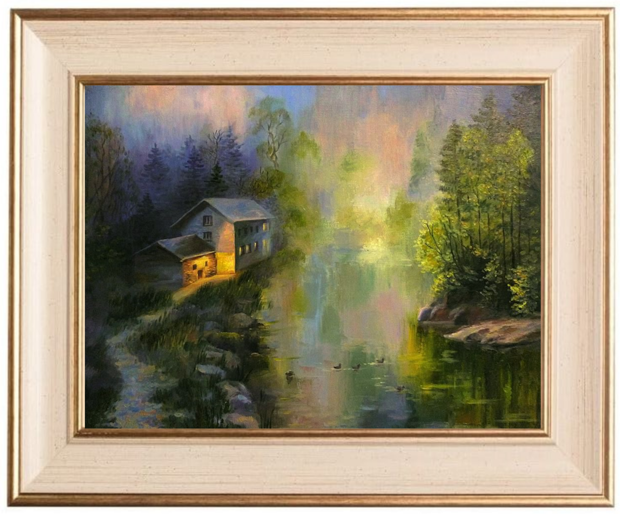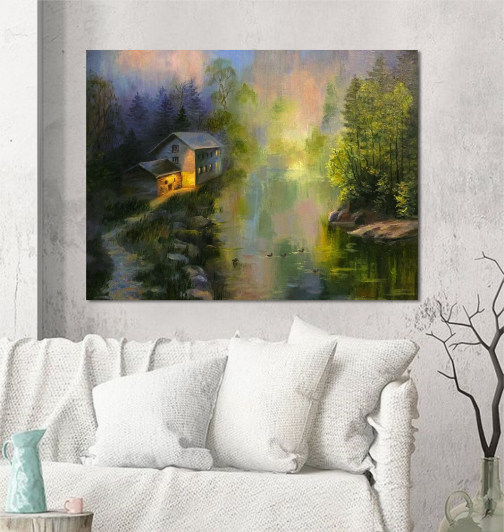 Картина маслом "Туманное озеро"" написана на холсте на подрамнике ручной работы. Размер 44/58 см., толщина подрамника 2 см, торцы в цвет картины.