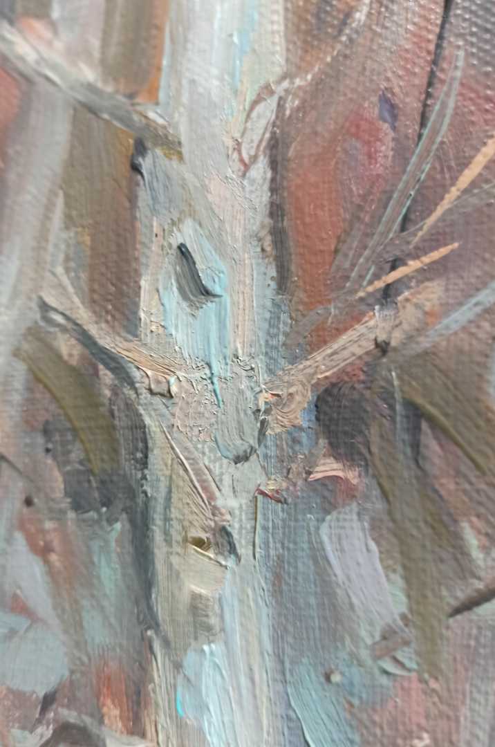 Техника исполнения: Картина выполнена в манере, близкой к импрессионизму: мазки свободные, выразительные, без излишней гладкости. Используются контрасты света и тени, тёплые и холодные оттенки для создания объёма и настроения.