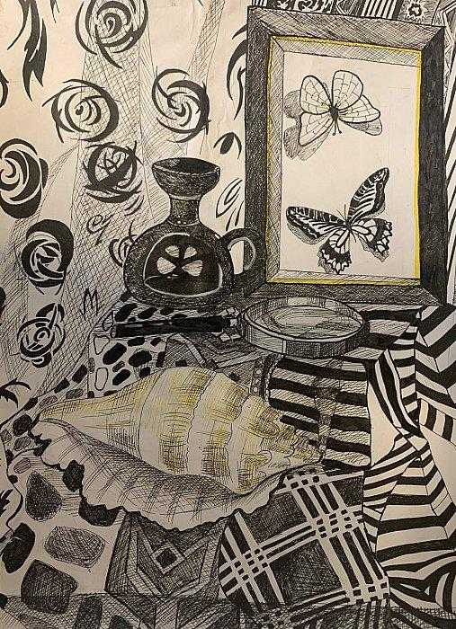Этот натюрморт — медитация на контрасте природы и рукотворного, органики и геометрии. Монохромная штриховка с золотистыми акцентами подчёркивает хрупкую игру света, тени, движения и неподвижности: бабочки символизируют трансформацию и мимолётность, раковина — память и течение времени, а динамичные у