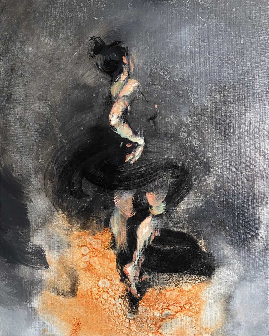 Картина "Танец", в вихре закружилась девушка. Точными мазками по форме выполнена работа с телом, экспрессивный фон создает движение. Картина маслом на холсте