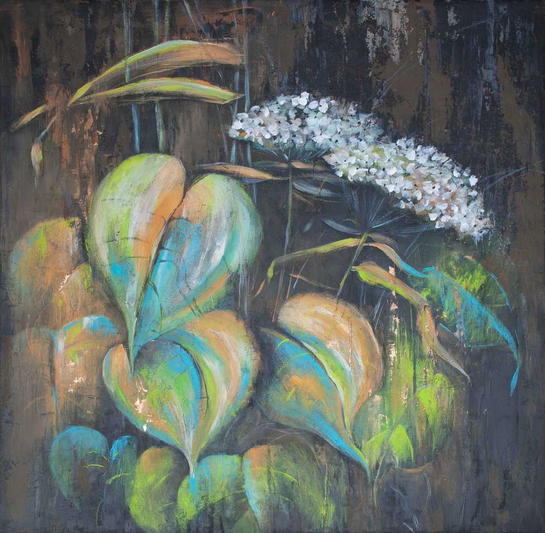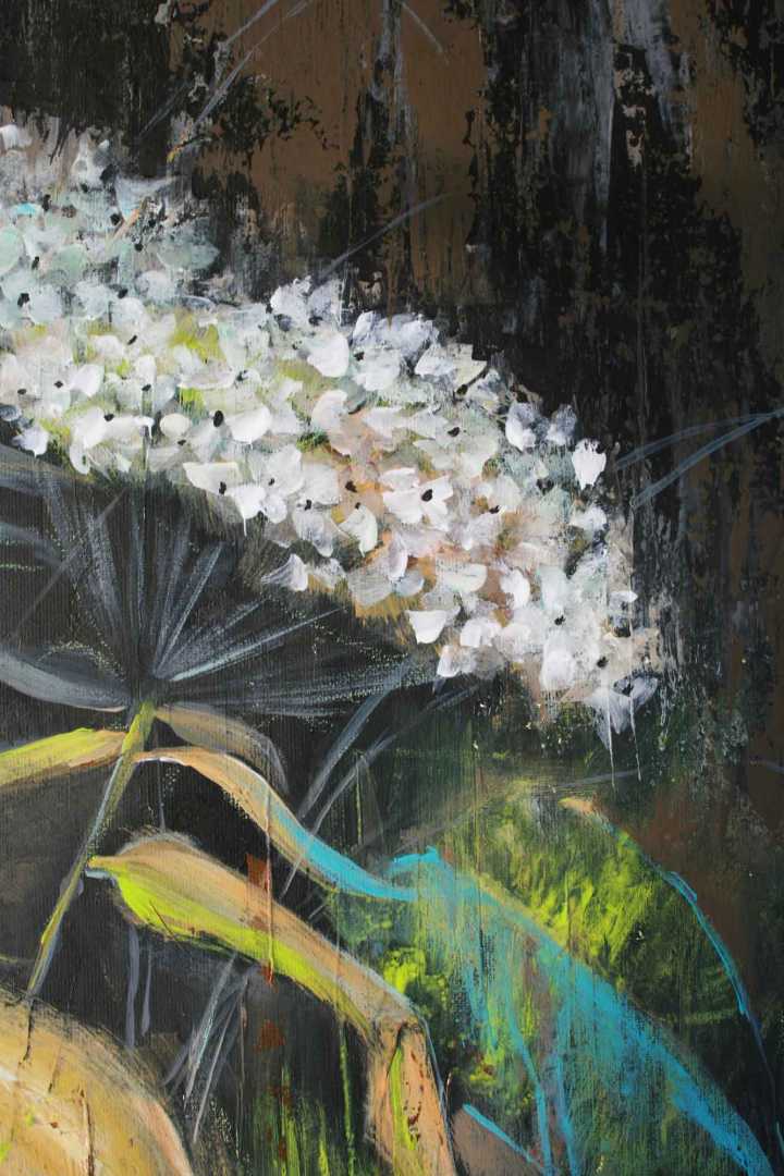 Эта выразительная картина с гортензией выполнена акрилом на холсте в современной импрессионистичной манере. Белоснежные соцветия гортензии эффектно выделяются на темном фактурном фоне, создавая драматический контраст.