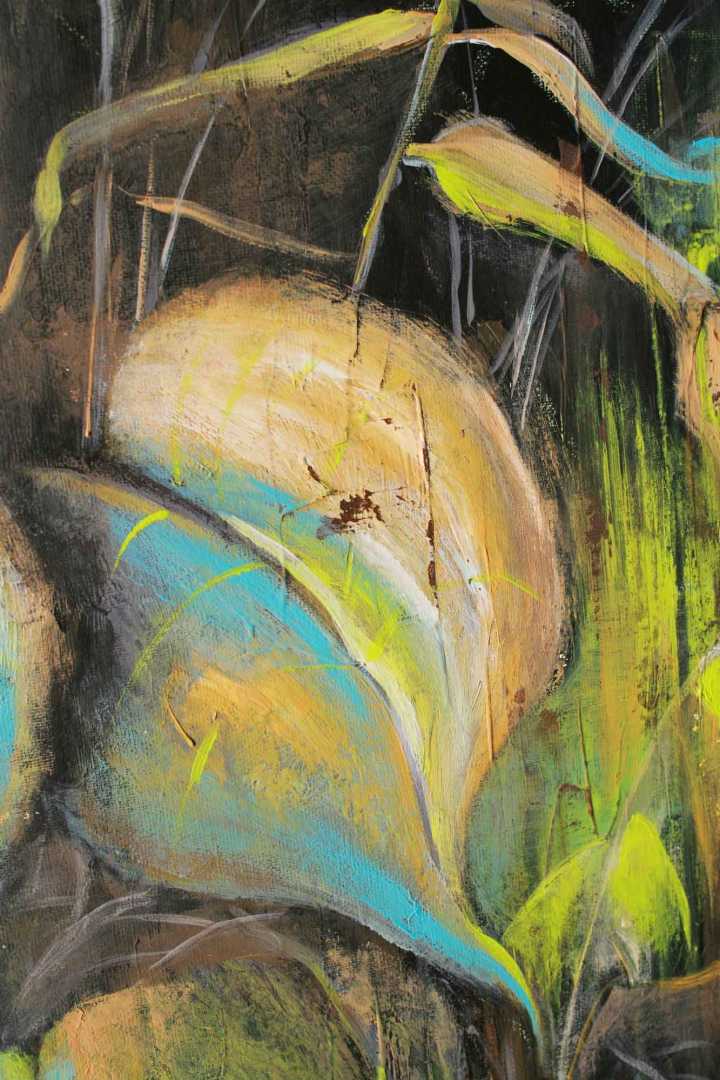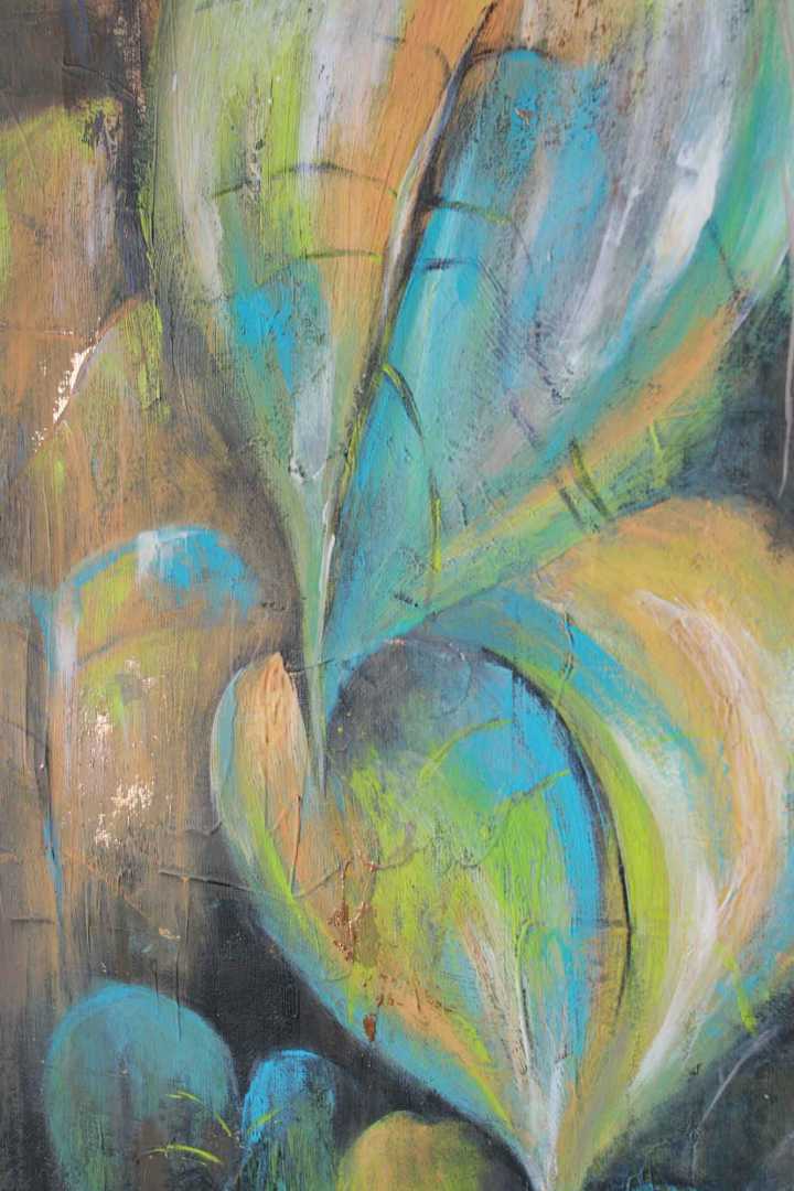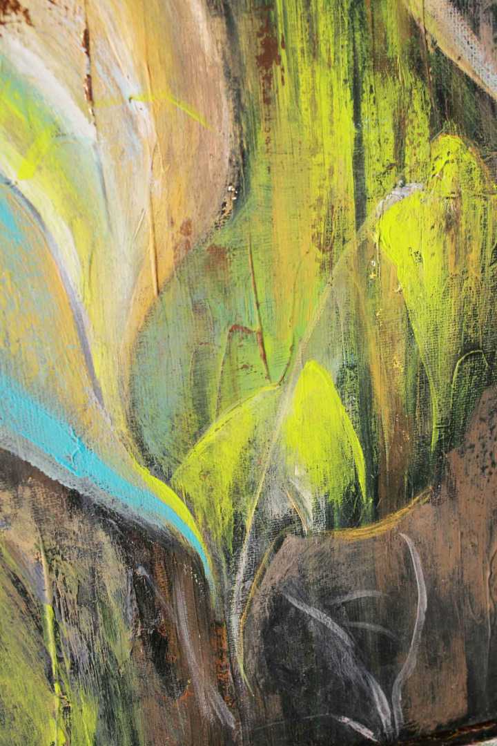 енные бирюзовые, изумрудные, теплые охристые и оранжевые оттенки. Свободные живописные мазки и богатая текстура придают работе динамику и эмоциональность. Темный фон с вертикальными потеками и наслоениями краски добавляет глубину и таинственность композиции.