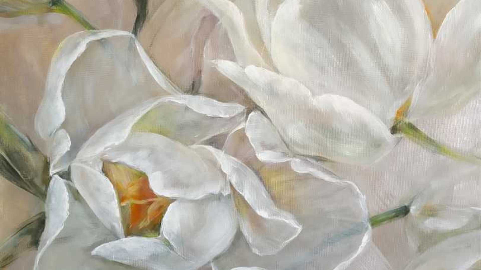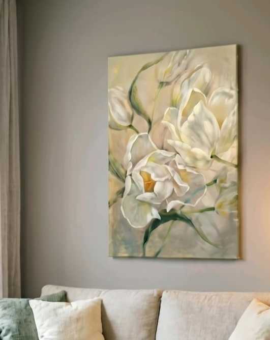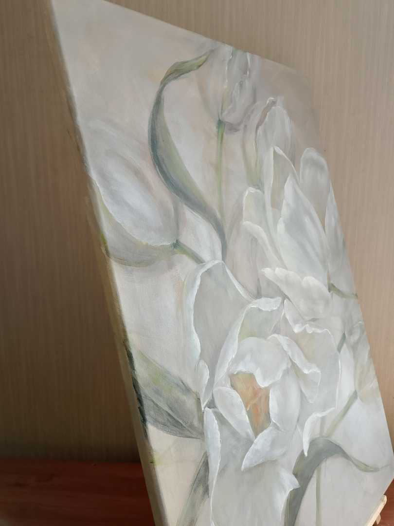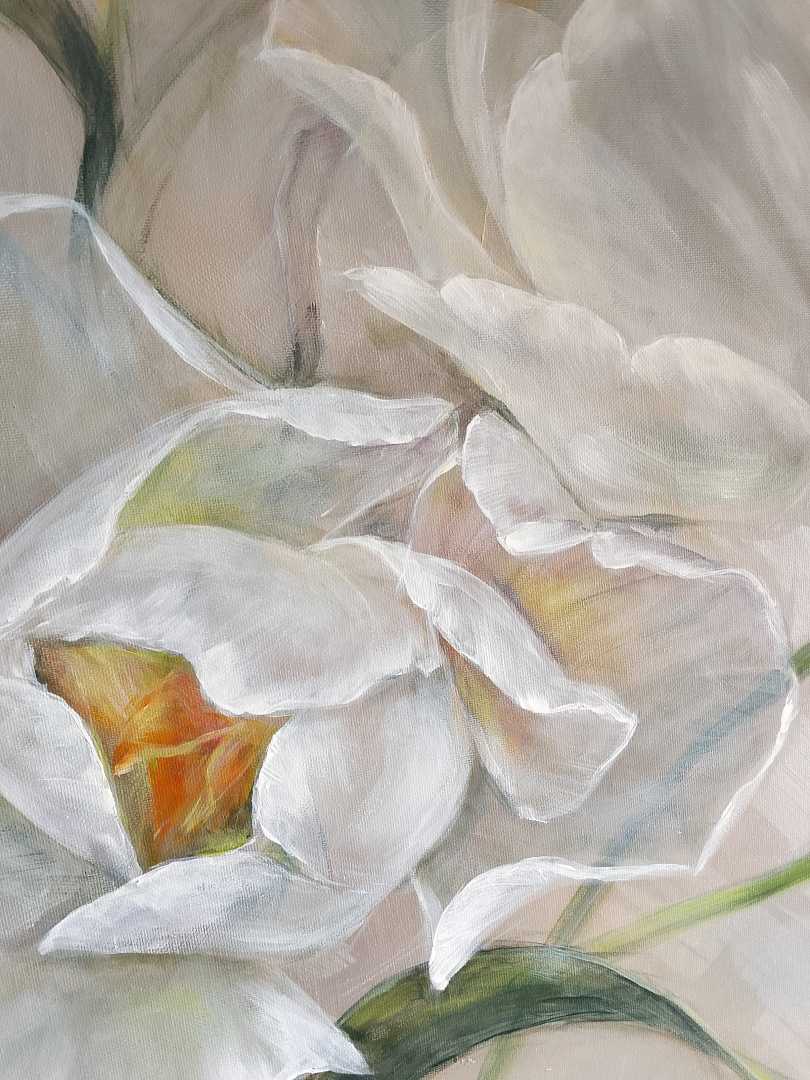В нежном полумраке, окутанном вуалью времени, распускаются призрачные белые тюльпаны, словно материализовавшиеся из утреннего тумана. Их лепестки, лёгкие как шёлк, струятся в немом танце, создавая хоровод невинности и чистоты.