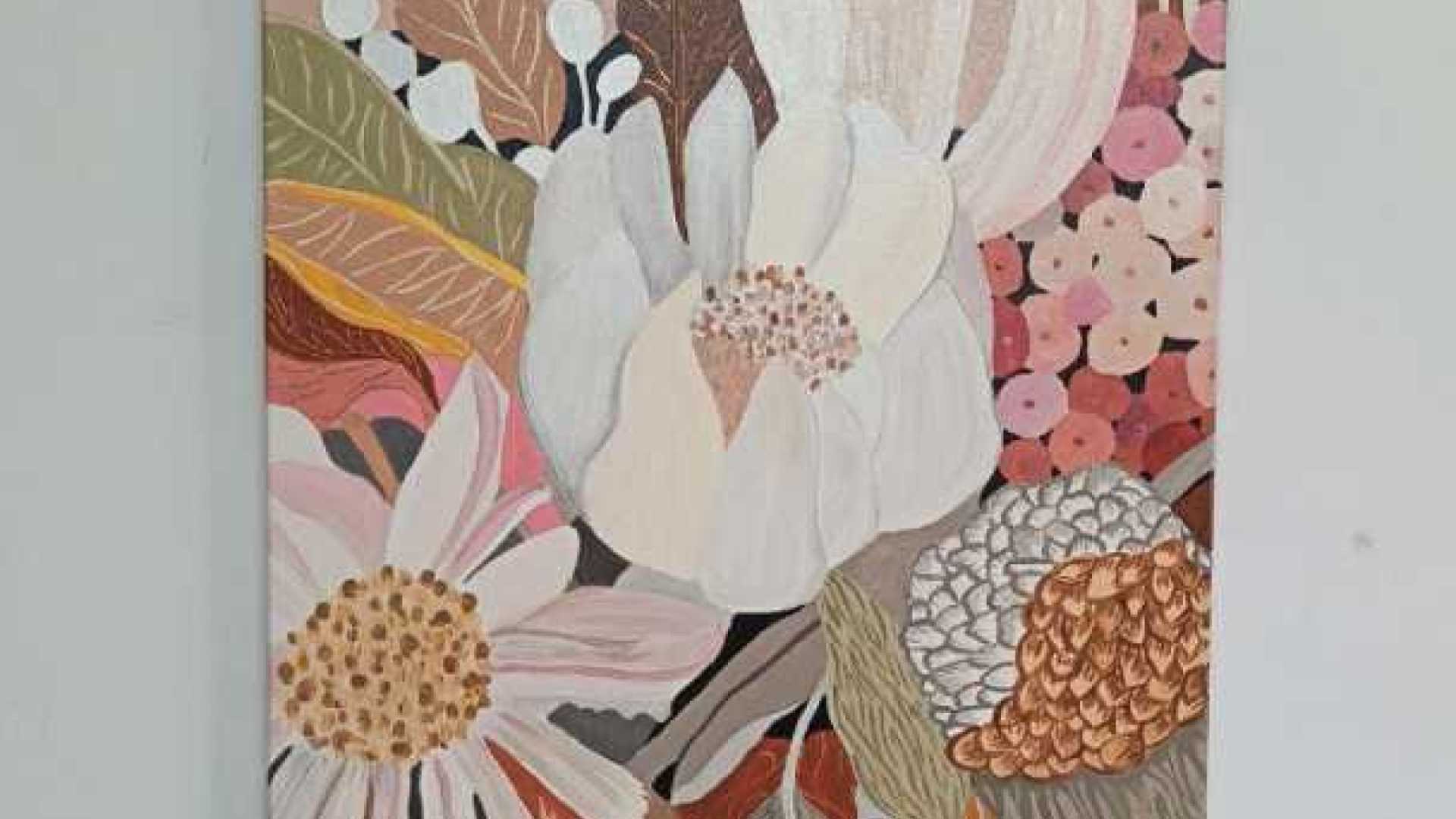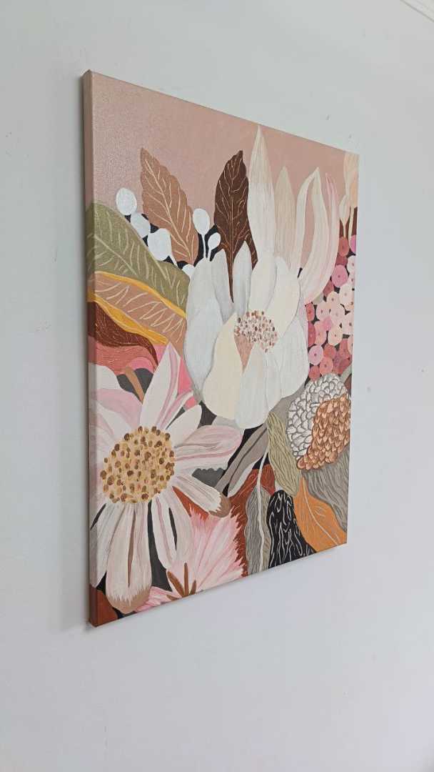Стилизованная цветочная композиция в тёплой палитре: нежные розовые и бежевые цветы, зелёные листья, акценты коричневого — всё выстроено как узор, без излишнего натурализма. Лёгкая текстура и матово-глянцевое лаковое покрыти