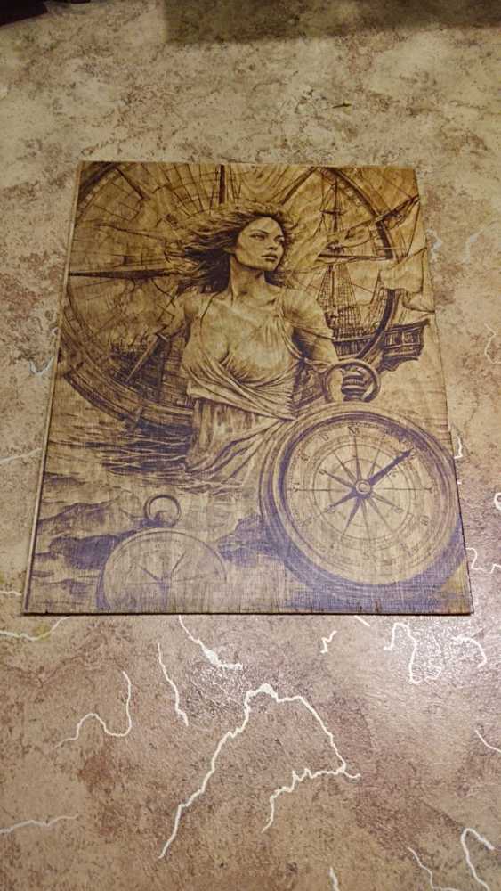 Авторская работа, выполненная в технике выжигания по дереву. На картине изображена женщина-символ морской стихии — она держит штурвал, а за её спиной виден парусный корабль и компас. Тёплая фактура дерева подчёркивает глубину образа и ощущение путешествия сквозь время. Картина ассоциируется со свобо