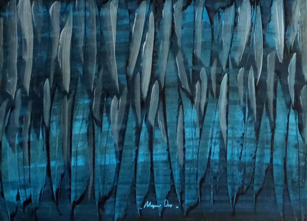 Картина «Лавина» — динамичная абстрактная композиция, построенная на вертикальном ритме и глубокой холодной палитре. Перетекающие формы и контраст светлых и тёмных оттенков создают ощущение стремительного движения.