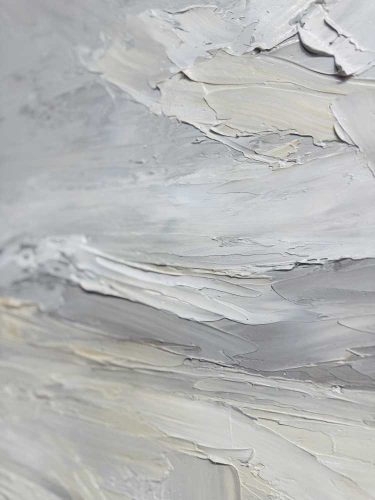 Эта работа про светлое, спокойное пространство. Про момент, когда всё вокруг тихо: вода неподвижна, небо мягкое и светлое, а воздух кажется почти прозрачным. Картина построена на фактуре - густые мазки создают рельефную поверхность, которая меняется при разном освещении. Если смотреть близко, видно