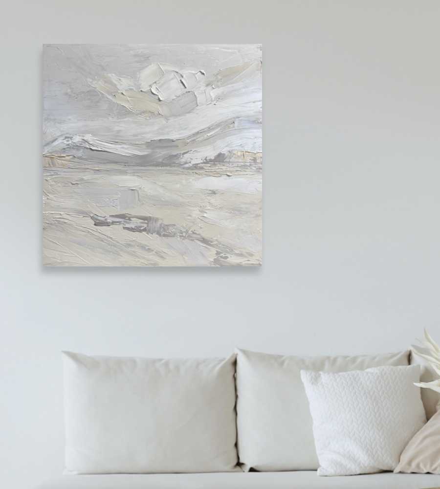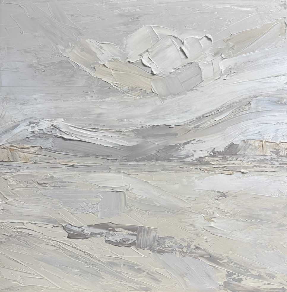 движение мастихина и слои краски. Издалека всё собирается в спокойный пейзаж. Мне хотелось передать ощущение света, воздуха и внутренней тишины. Такое состояние, когда можно остановиться, посмотреть и почувствовать спокойствие. 60 × 60 см Галерейный холст 2026
