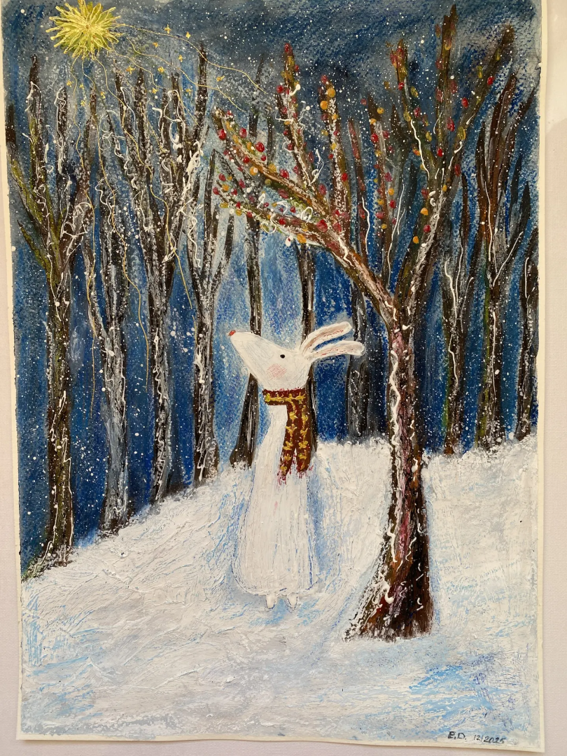 яя небо, деревья и живое существо в едином ритме. Ягоды на ветвях и золотые линии придают сцене ощущение защиты, надежды и тихой радости. Эта работа — о бережности, доверии и свете, который можно сохранить даже в самой глубокой зиме.