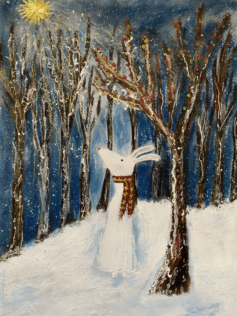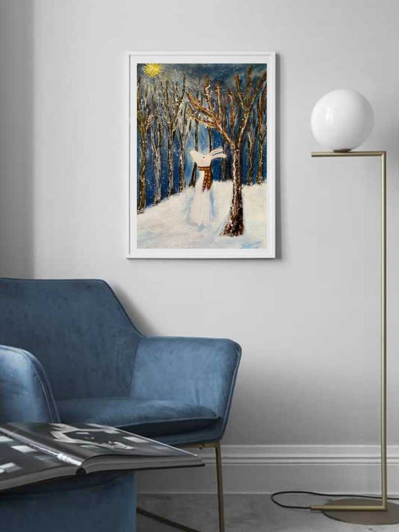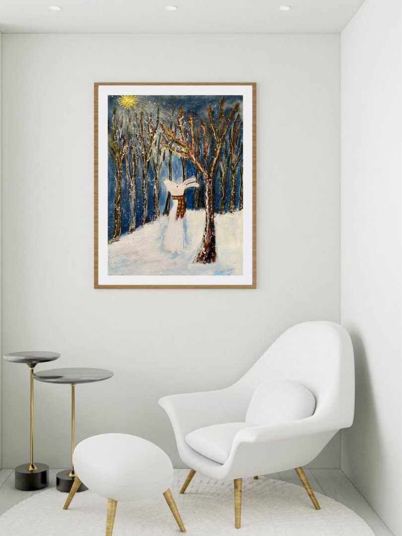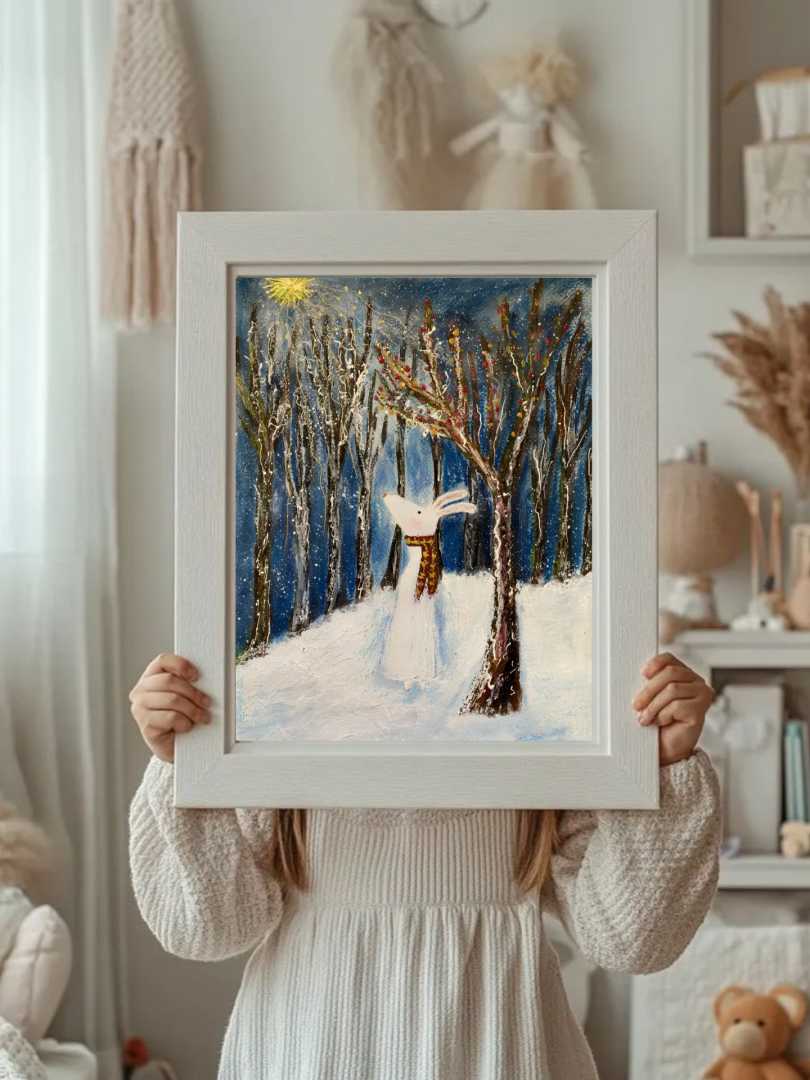 На этой картине зимний лес превращается в сказочное пространство тишины и чуда. Среди высоких тёмных стволов стоит белый заяц — хрупкий, но наполненный внутренним светом. Он словно прислушивается к миру, где снег искрится, а ночь дышит тайной.