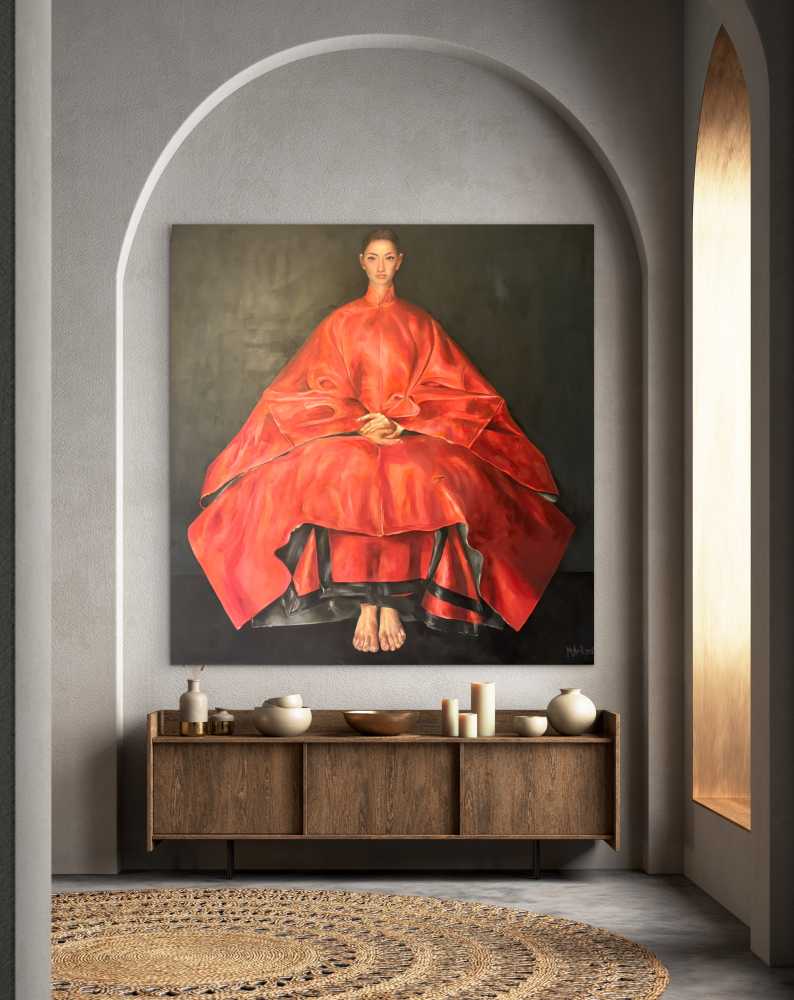 ых тонов. В её центре — образ женщины в традиционном восточном облачении, символ гармонии, внутренней силы и спокойствия. Картина наполнена атмосферой тишины и уверенности, создавая в интерьере ощущение баланса и глубины.