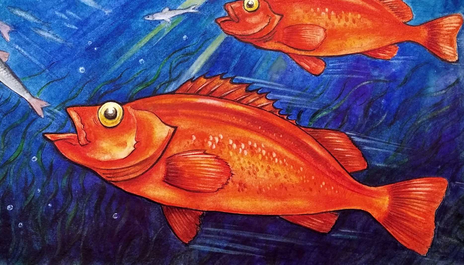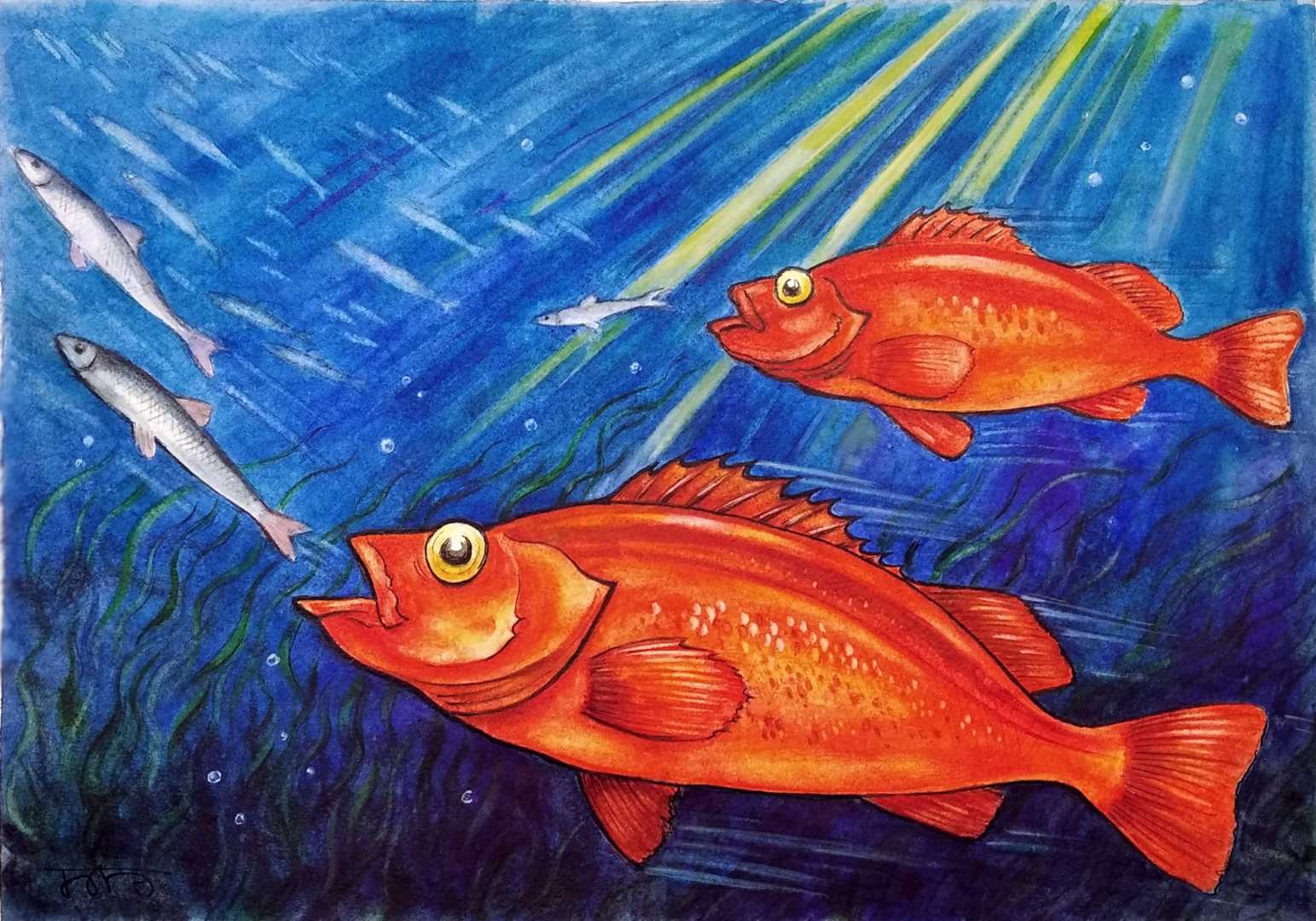 Охота морского окуня в морских глубинах. Акварель. Эти рыбы почти бессмертны, если мерить человеческой жизнью - загадка природы!