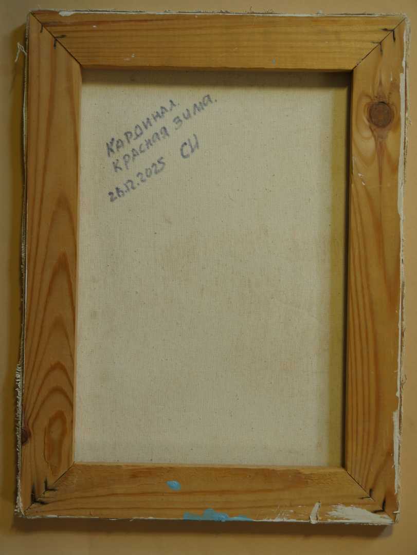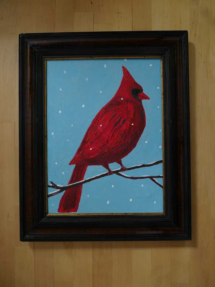 Кардинал, смелая, арко красная певчая птица сидит на ветви дерева. Падает снег. Картина оформлена в старинной раме