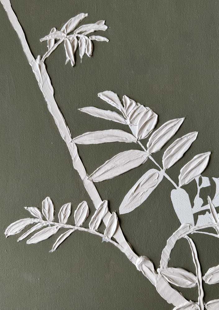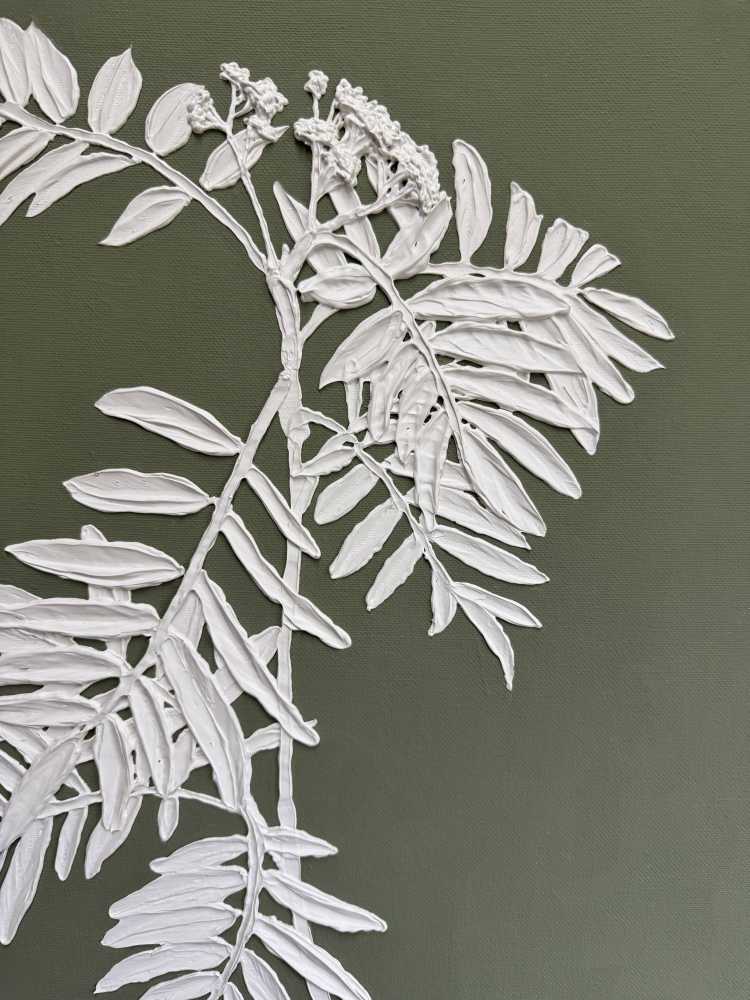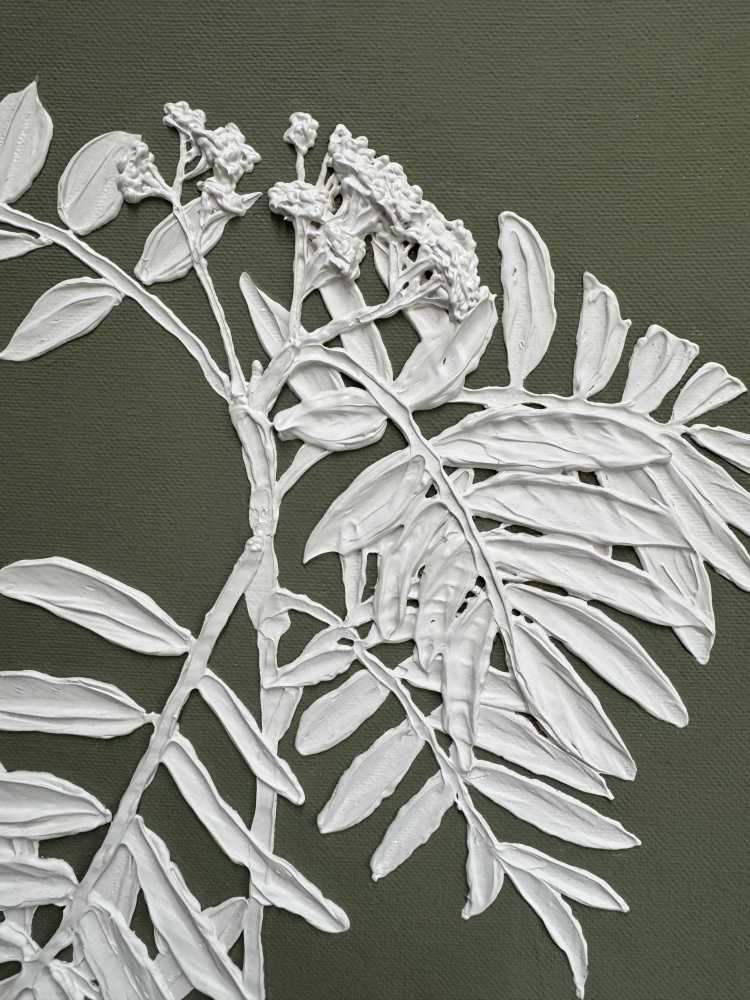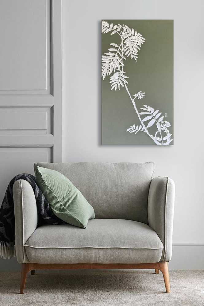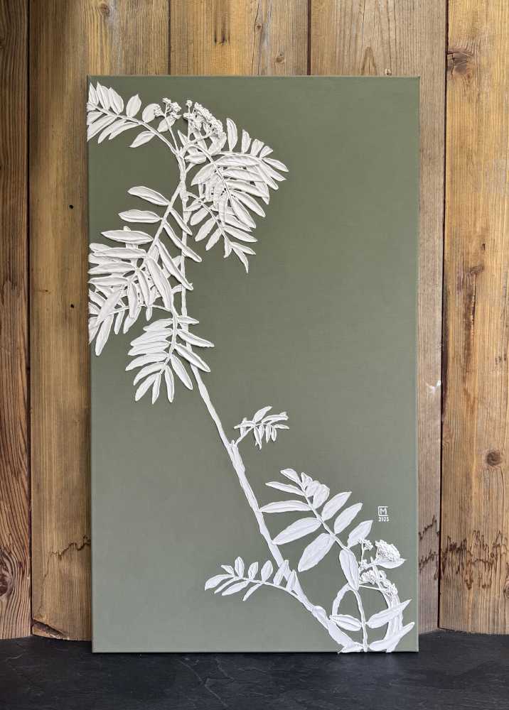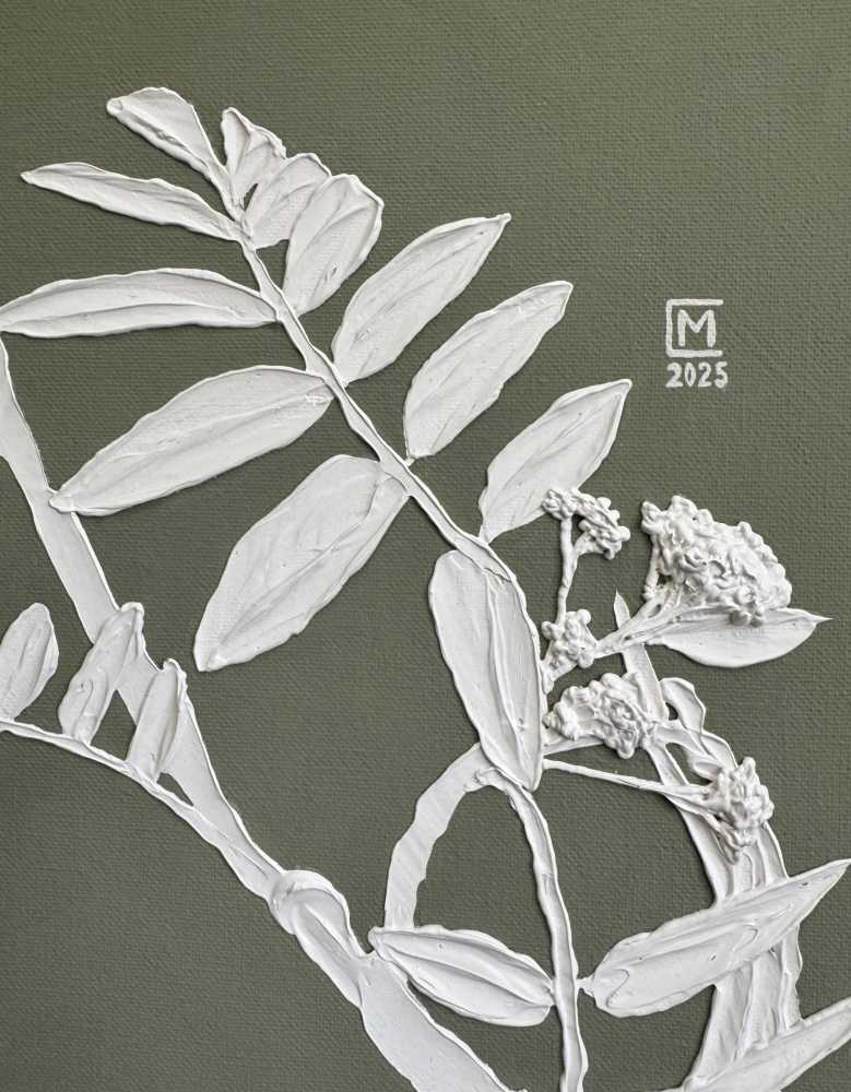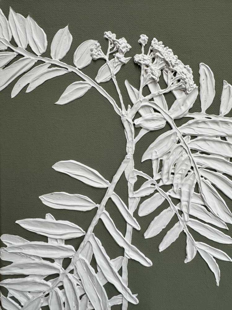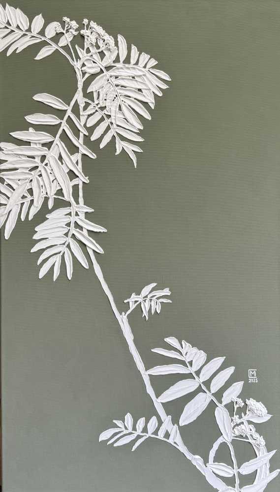 На картине изображена ветвь молодой рябины. Размер 40х70 см. Холст на подрамнике. Галерейная натяжка холста не требует оформления картины в раму. Торцы я валяются продолжением картины. Акрил. Текстурная паста. 2025.