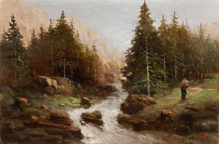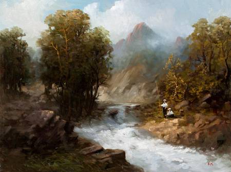 На картине изображен весенний апрельский горный пейзаж. На заднем фоне поляна с горными песочными тропами уходящими в расщелины скал. На переднем фоне ели и весенние цветы, и бурная река, которая пробила себе дорогу после весенних паводков. На картине изображено позднее присутствие человека. Лодка,