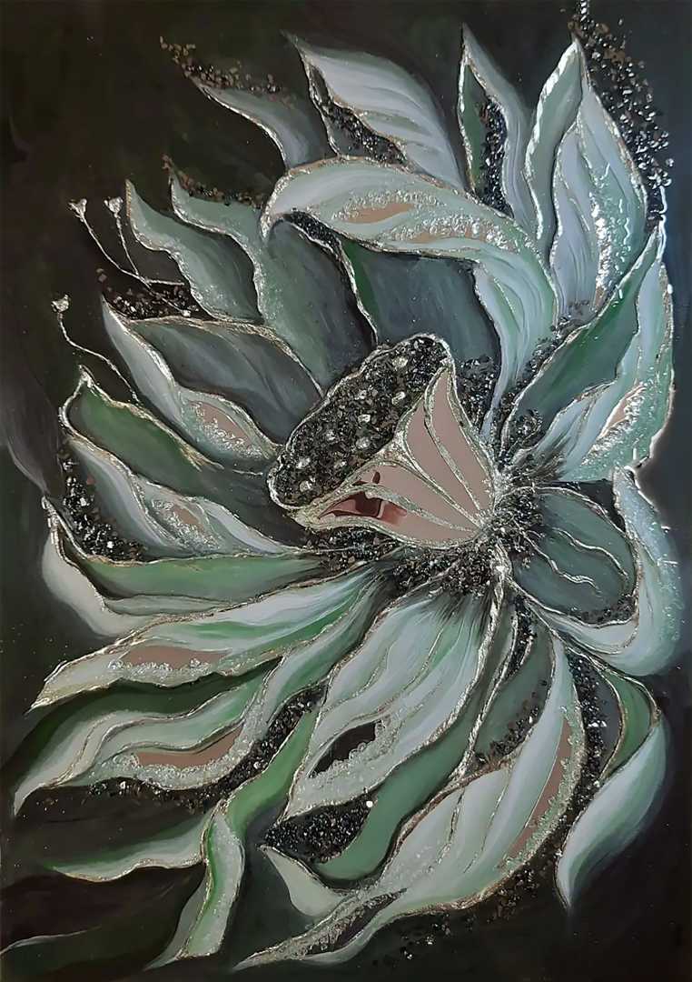 Величественный цветок лотоса в изысканной серебристо-зеленой гамме на темном фоне. Многоуровневая композиция с объемными лепестками создает ощущение глубины и движения. Эта картина наполнит ваше пространство умиротворением и загадочностью.
