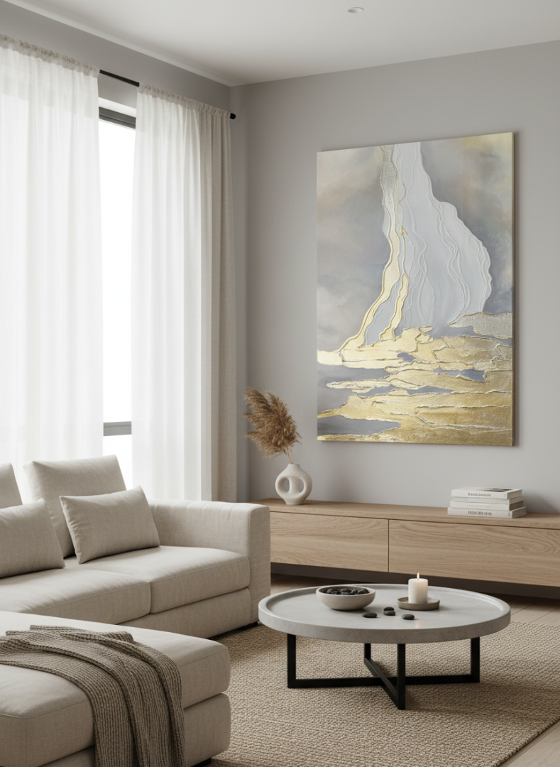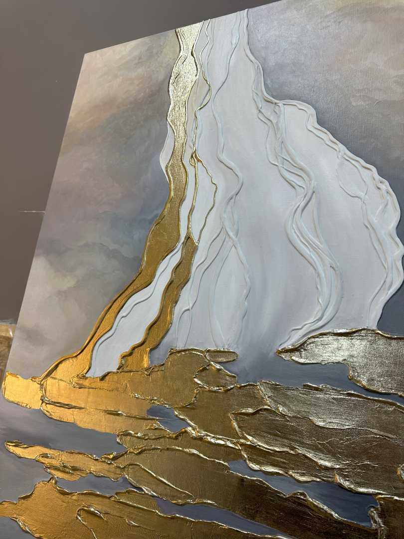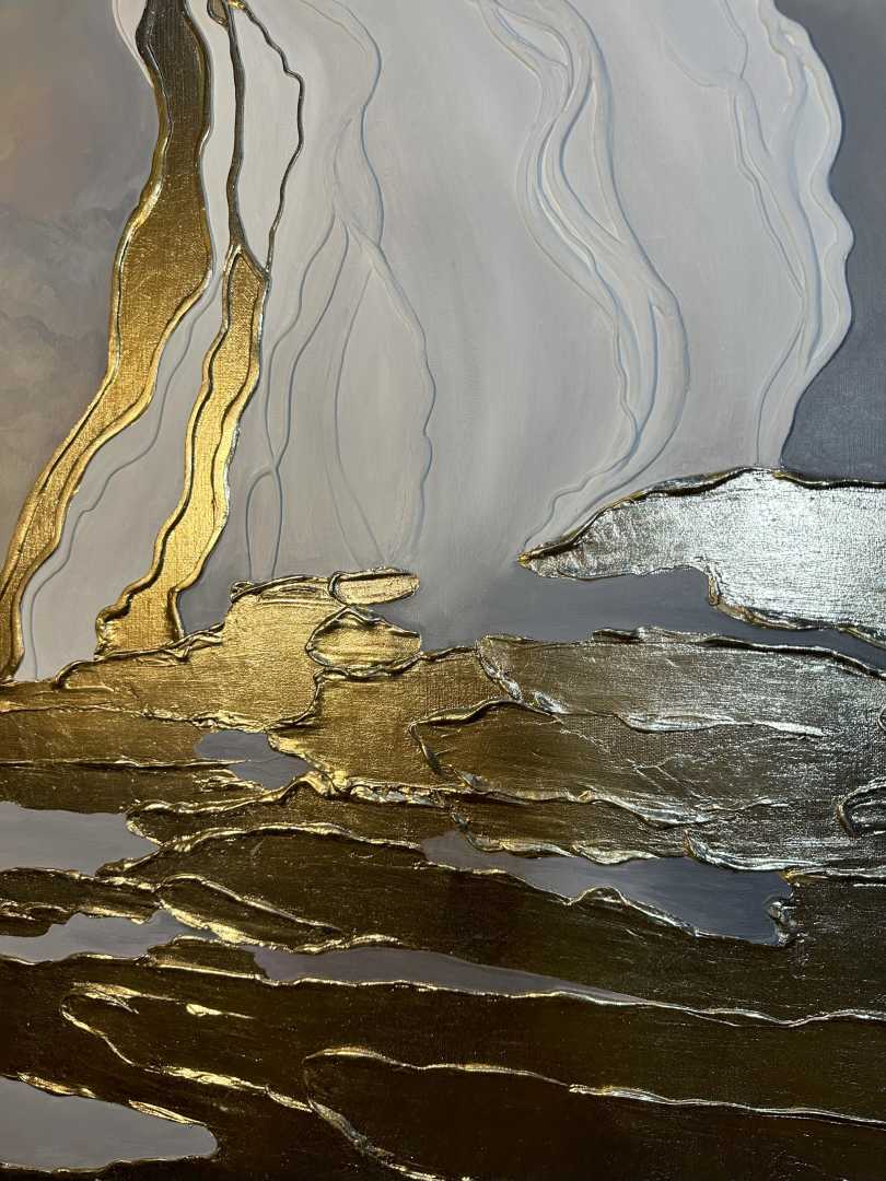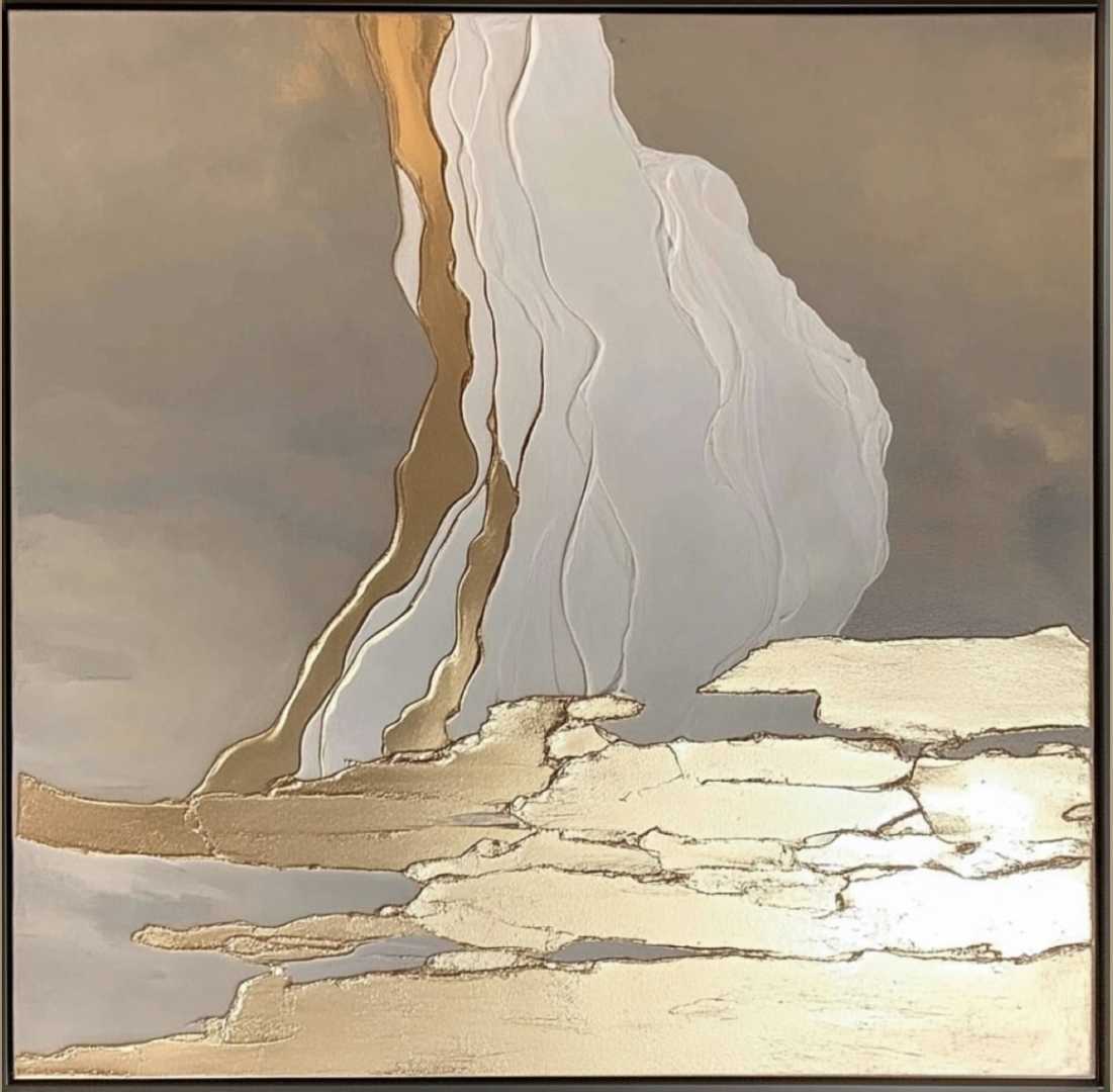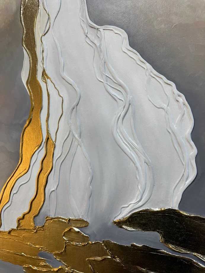 Аутентичная абстрактная картина, в котором фактура гипса и пластика текстуры встречаются с благородным сиянием потали. Композиция будто зафиксировала движение — рельефы и тени создают ощущение танца света, придавая глубину и утончённую роскошь. Идеален для минималистичных интерьеров, добавит тепла л
