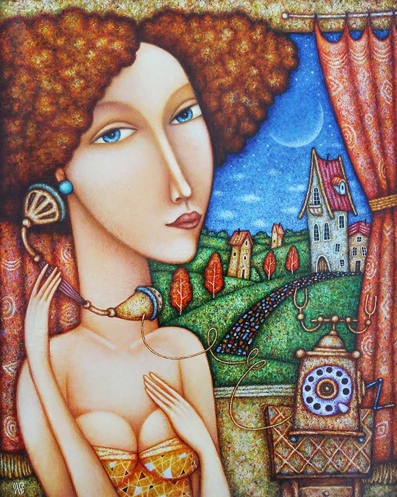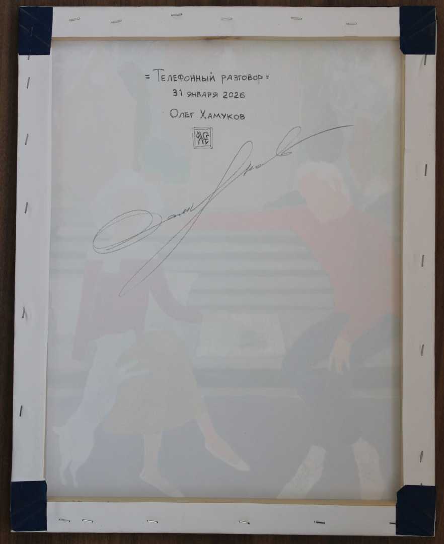В картине «Телефонный разговор» запечатлён момент интимного диалога, наполненного ностальгией и душевной теплотой. Через мягкость акриловых мазков создаётся ощущение погружения в личную историю, где связь с близкими приобретает особое значение. Картина приглашает заглянуть внутрь и услышать шепот во