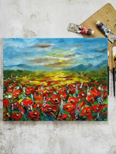 Маки - довольно популярный цветок в декоре интерьера! Очень яркий и в то же время нежный, легкий. Красный мак, как символ фэн-шуй, означает удовольствие в соответствии с китайской символикой: благополучие, отдых, красота, успех. Картину с маками можно смело вешать в доме!