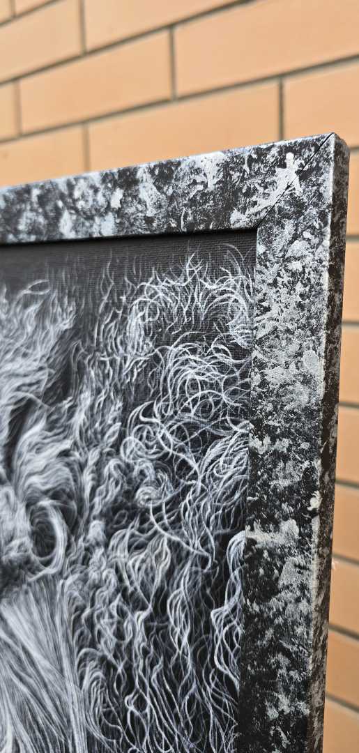 Картина поставляется готовой к размещению в интерьере, оформленная в черно-серебристую авторскую рамку (на фото на фоне кирпичной стены).
