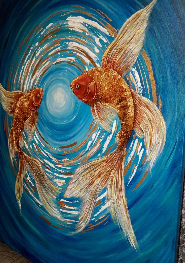 Картина выполнена на хлопковом холсте, размером 100х80 см. Холст на подрамнике, торцы прокрашены. Материалы использовались: акрил художественный, контур акриловый, супер поталь, натуральный балтийский янтарь. Покрыта акриловым лаком.