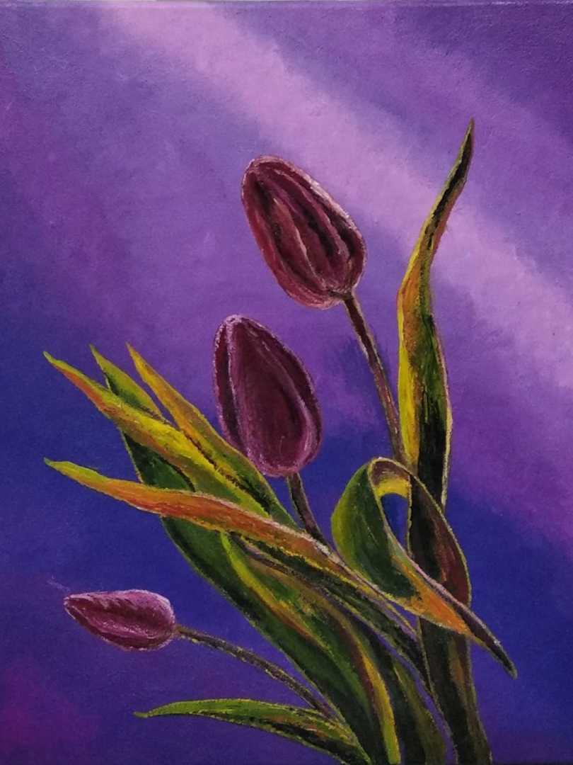 Главным объектом являются фиолетовые тюльпаны в луче света который подчёркивает объём и фактуру цветов, создавая эффект живого сияния.