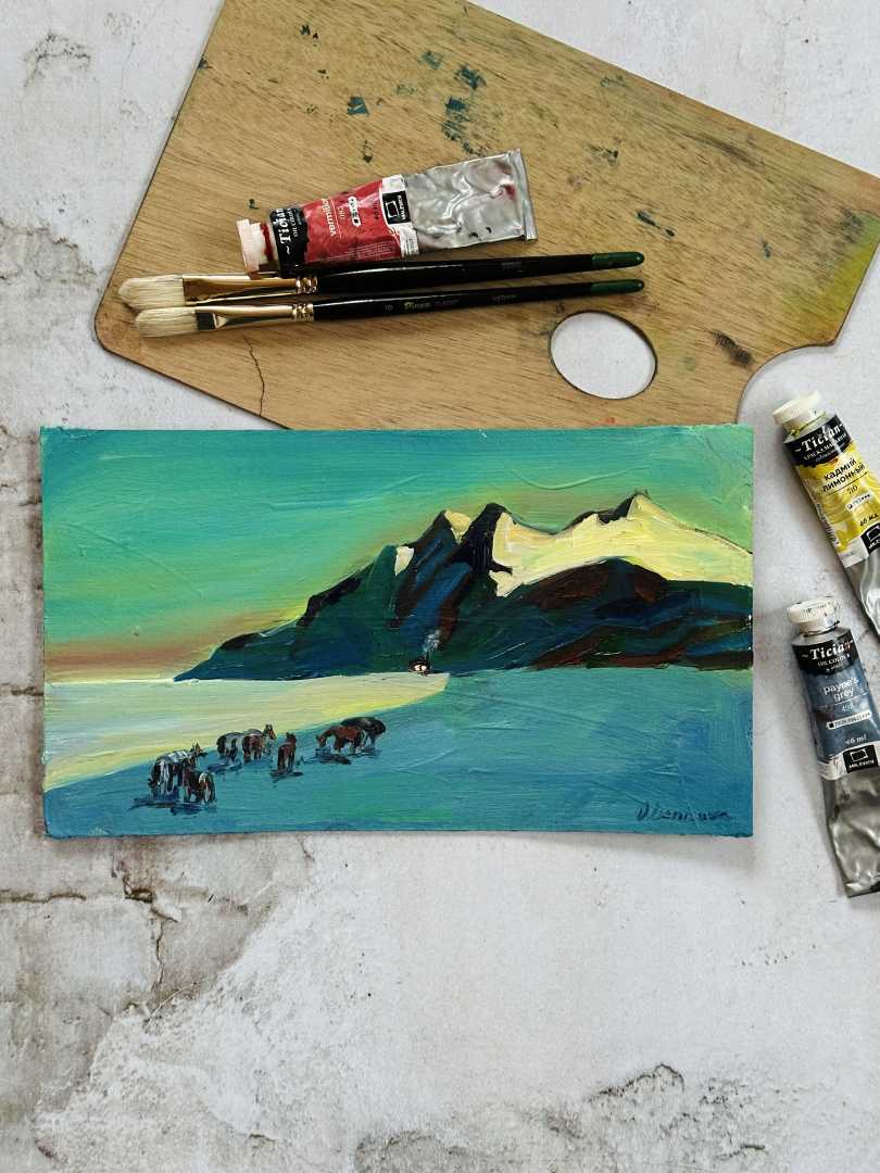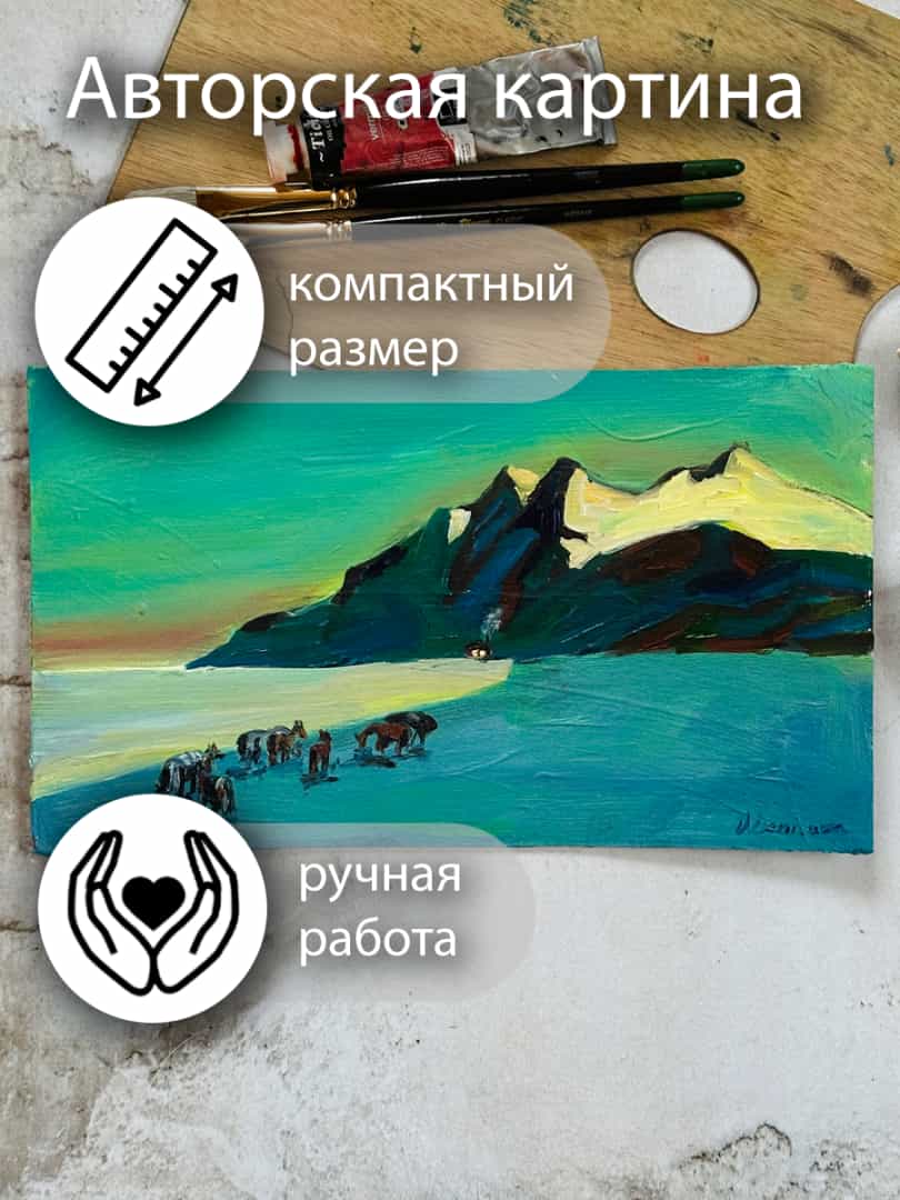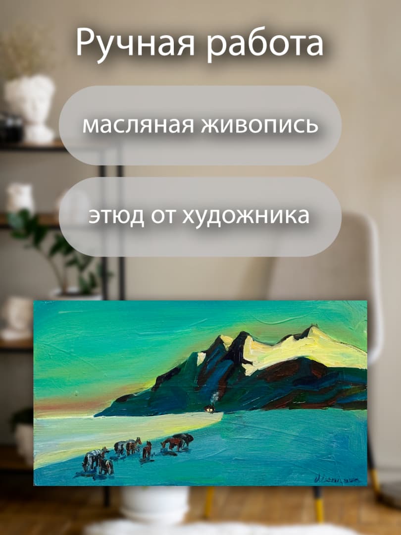 Почувствуйте зов гор и шепот ветра... Перед вами не просто картина, а живой отпечаток момента. Умиротворенный пейзаж с величественными горами и вольным табуном лошадей перенесет вас в атмосферу абсолютного покоя и уединения. Это идеальный выбор для тех, кто ищет в искусстве «тишину» и гармонию с при