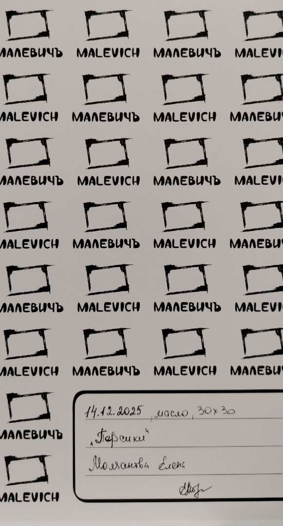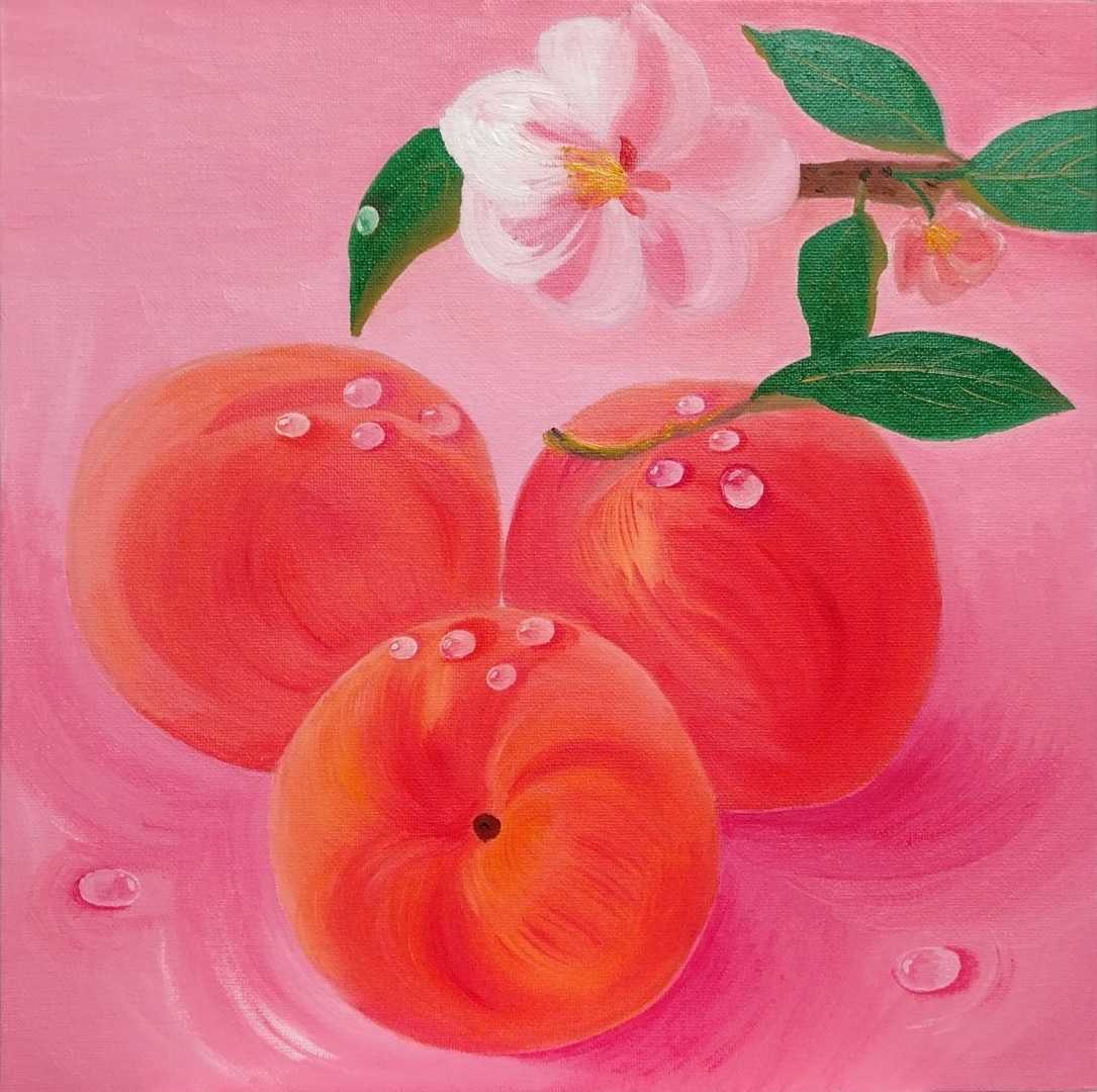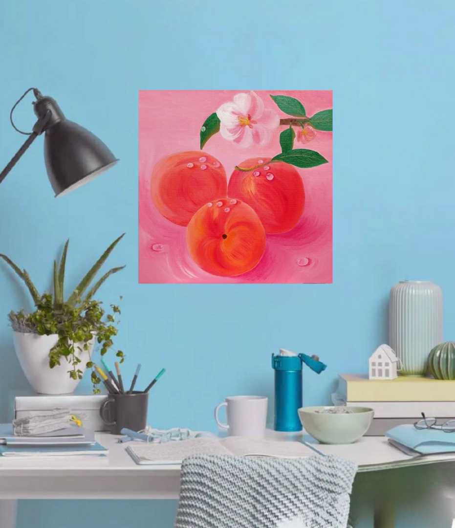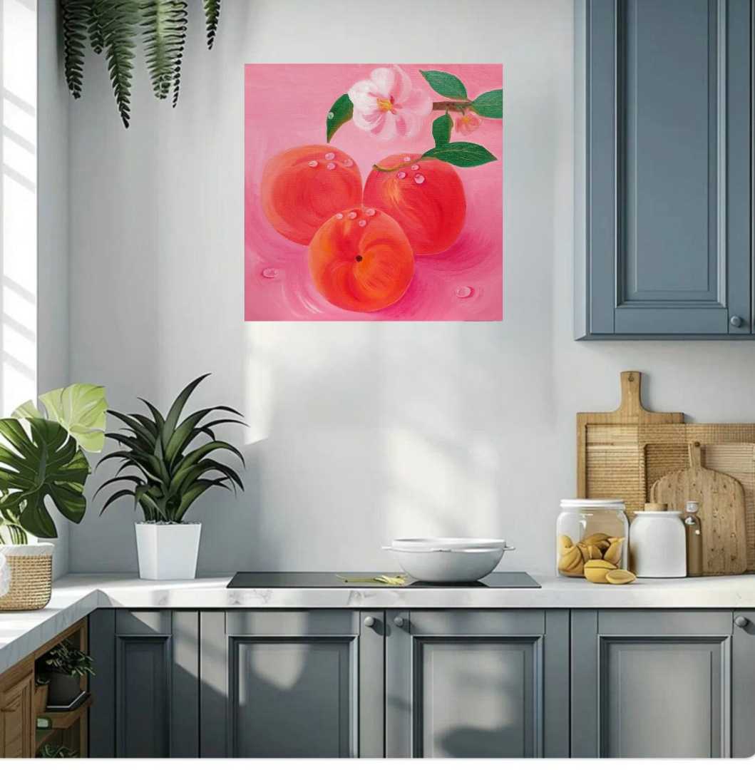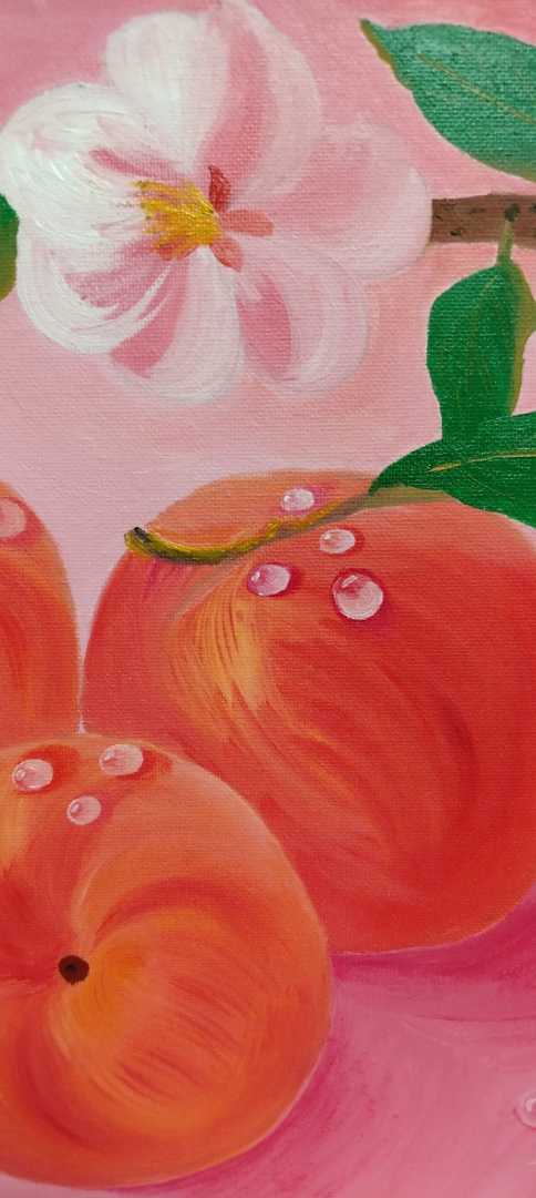 Картина размером 30х30 см выполнена масляными красками и покрыта защитным лаком, что придаёт работе глубокий блеск и долговечность. На полотне изображены три сочных персика на фоне нежно-розового цвета, дополненные веточкой с зелёными листьями и нежным цветком. Художник мастерски передал текстуру и
