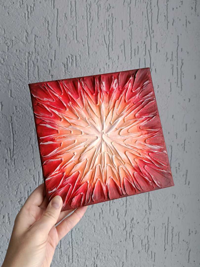 Абстрактная картина в красно-бордовых и персиковых тонах, напоминающая пламя или восход солнца. Символизирует энергию, движение и начало нового.