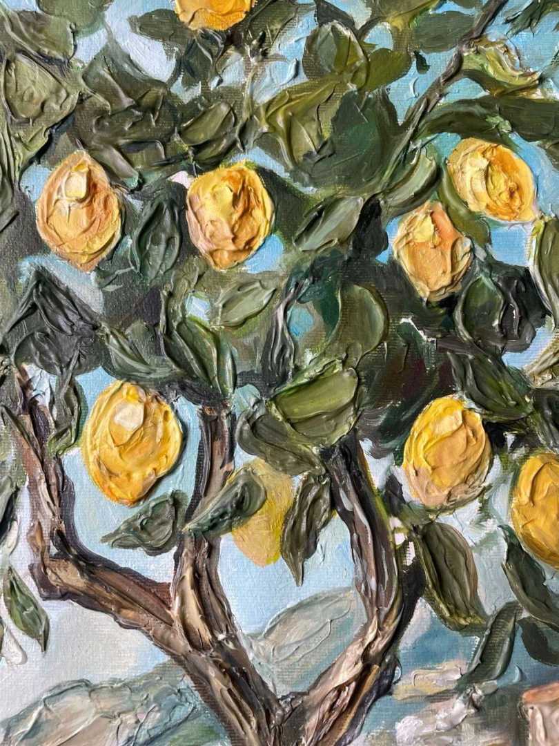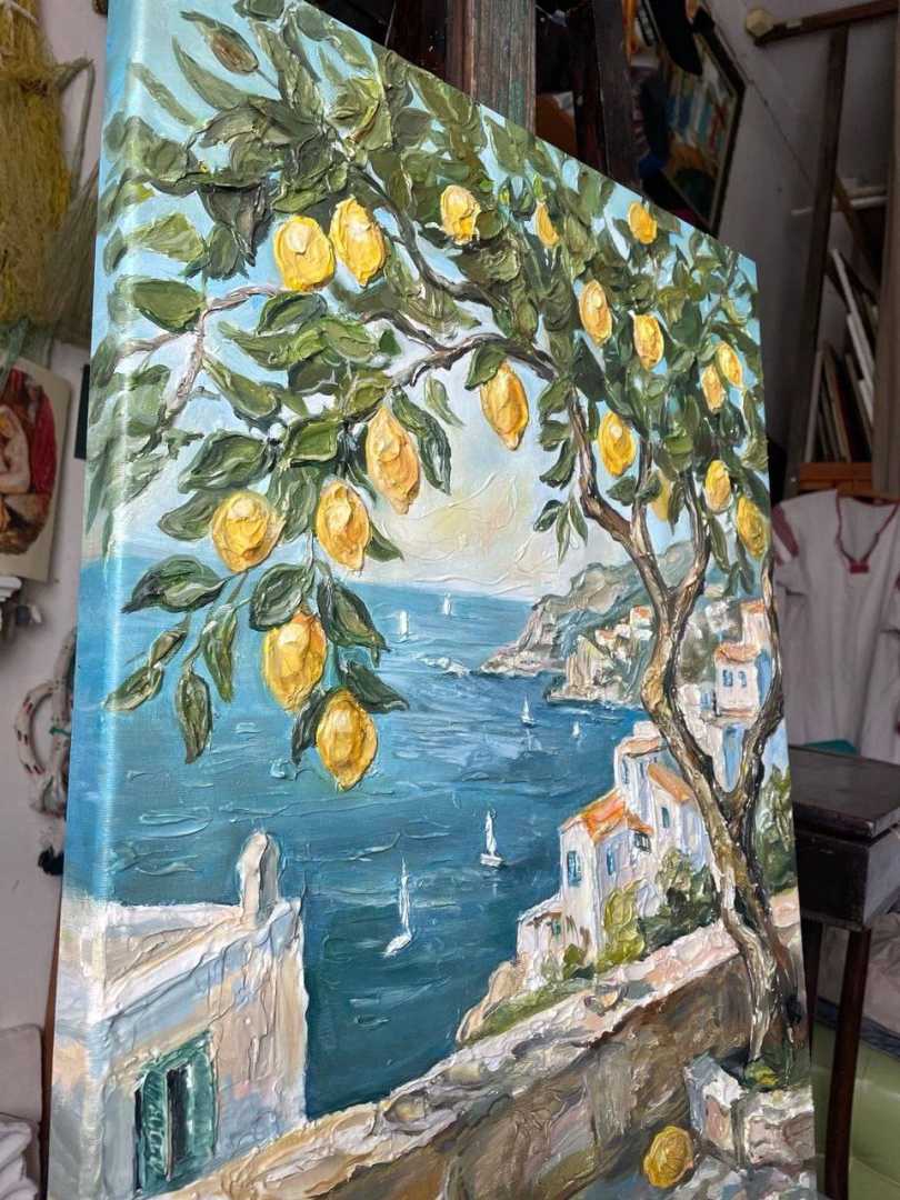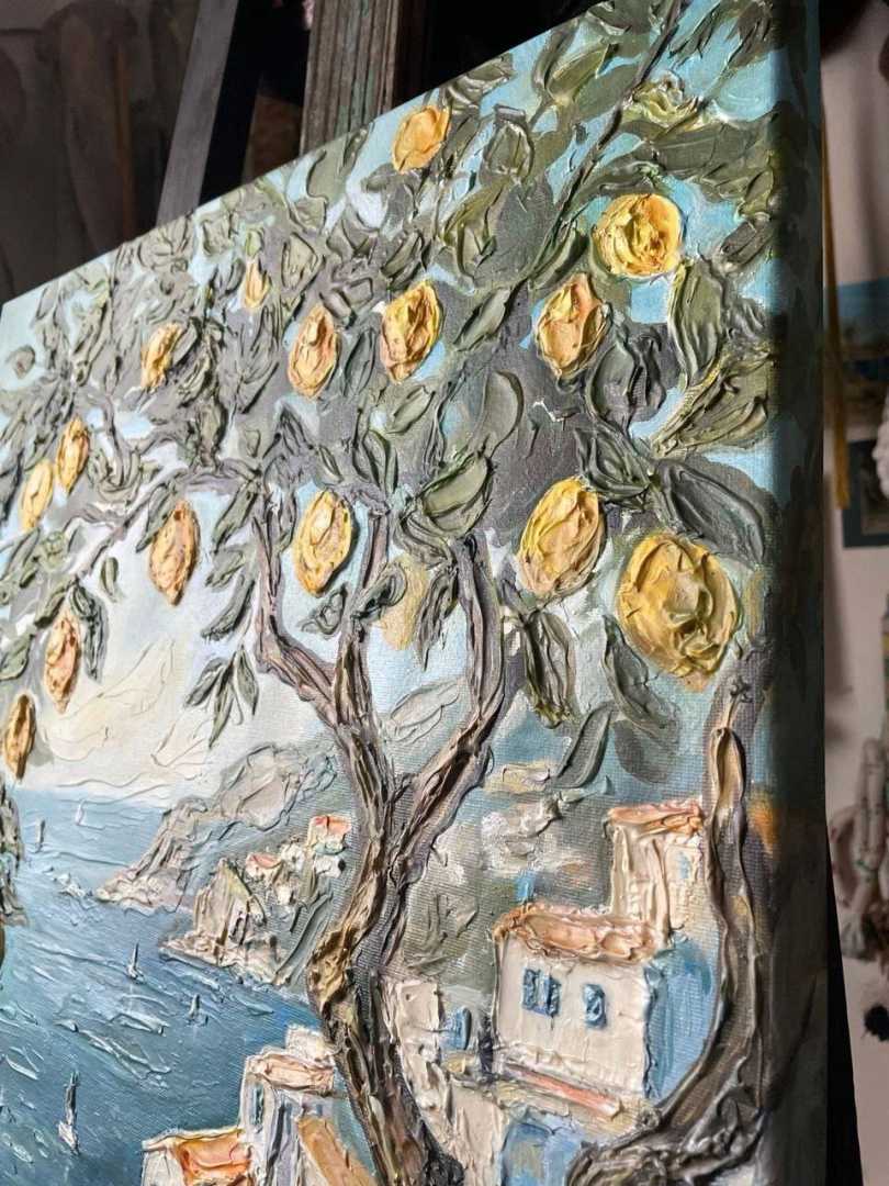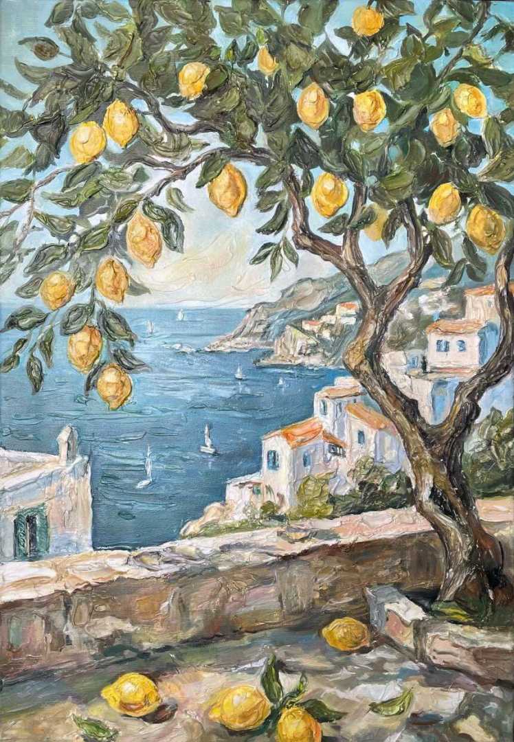 Почувствуйте тепло итальянского солнца и свежесть морского бриза, не выходя из дома! На полотне разворачивается захватывающий вид на побережье Амальфи. На переднем плане — раскидистое лимонное дерево, усыпанное спелыми, ярко-желтыми плодами. Сквоз