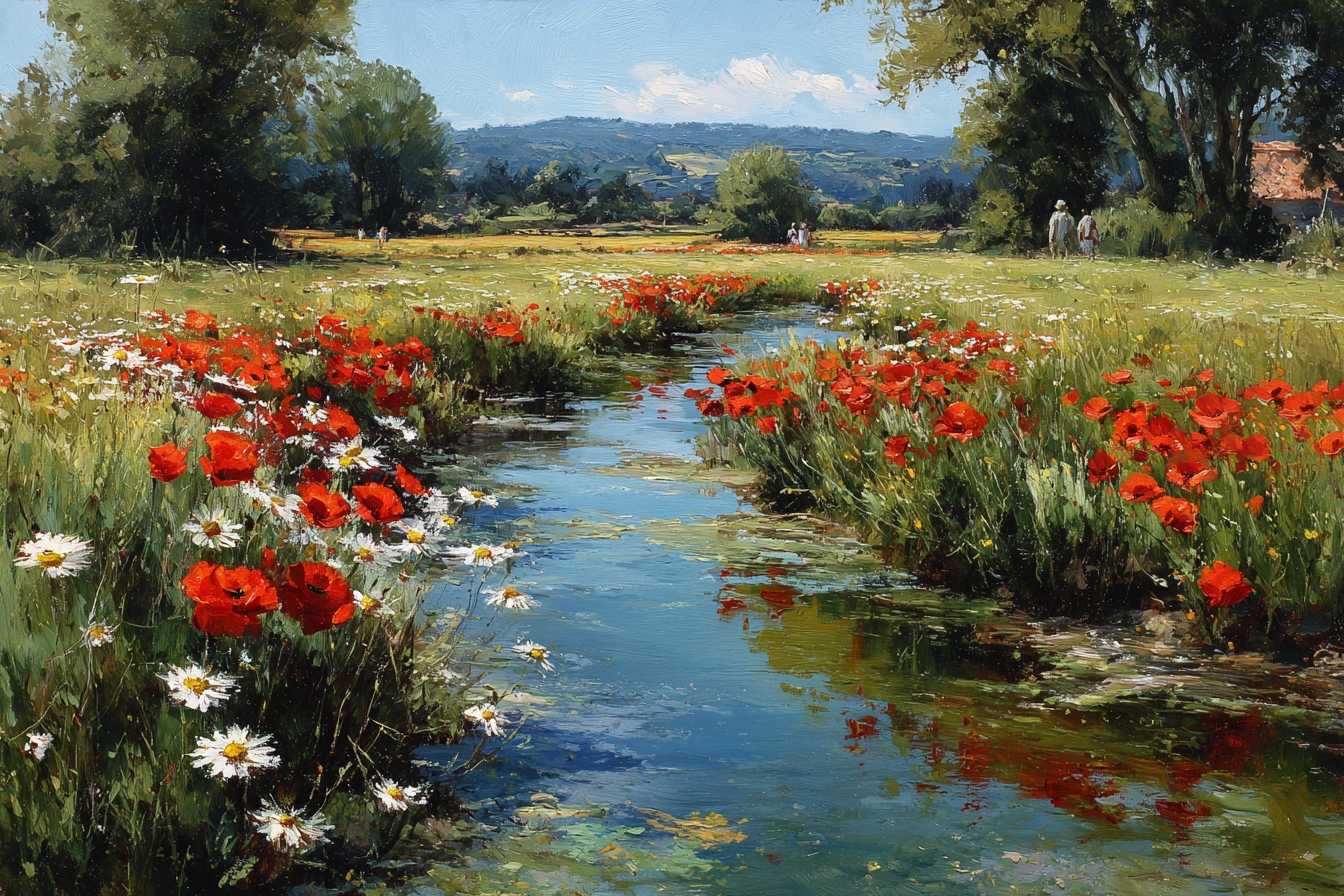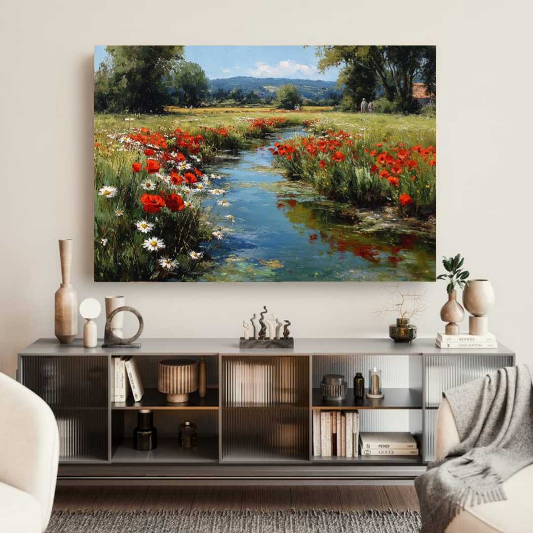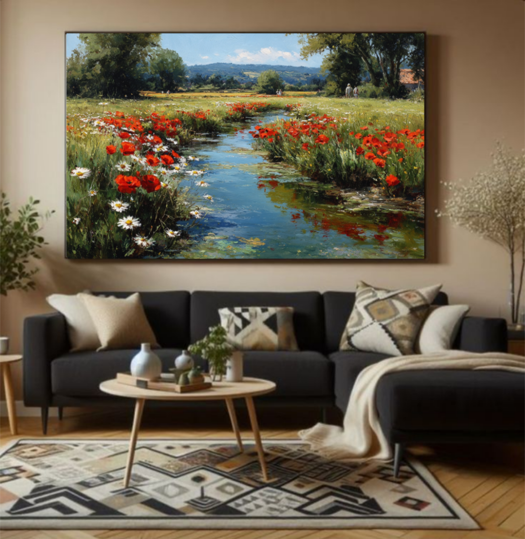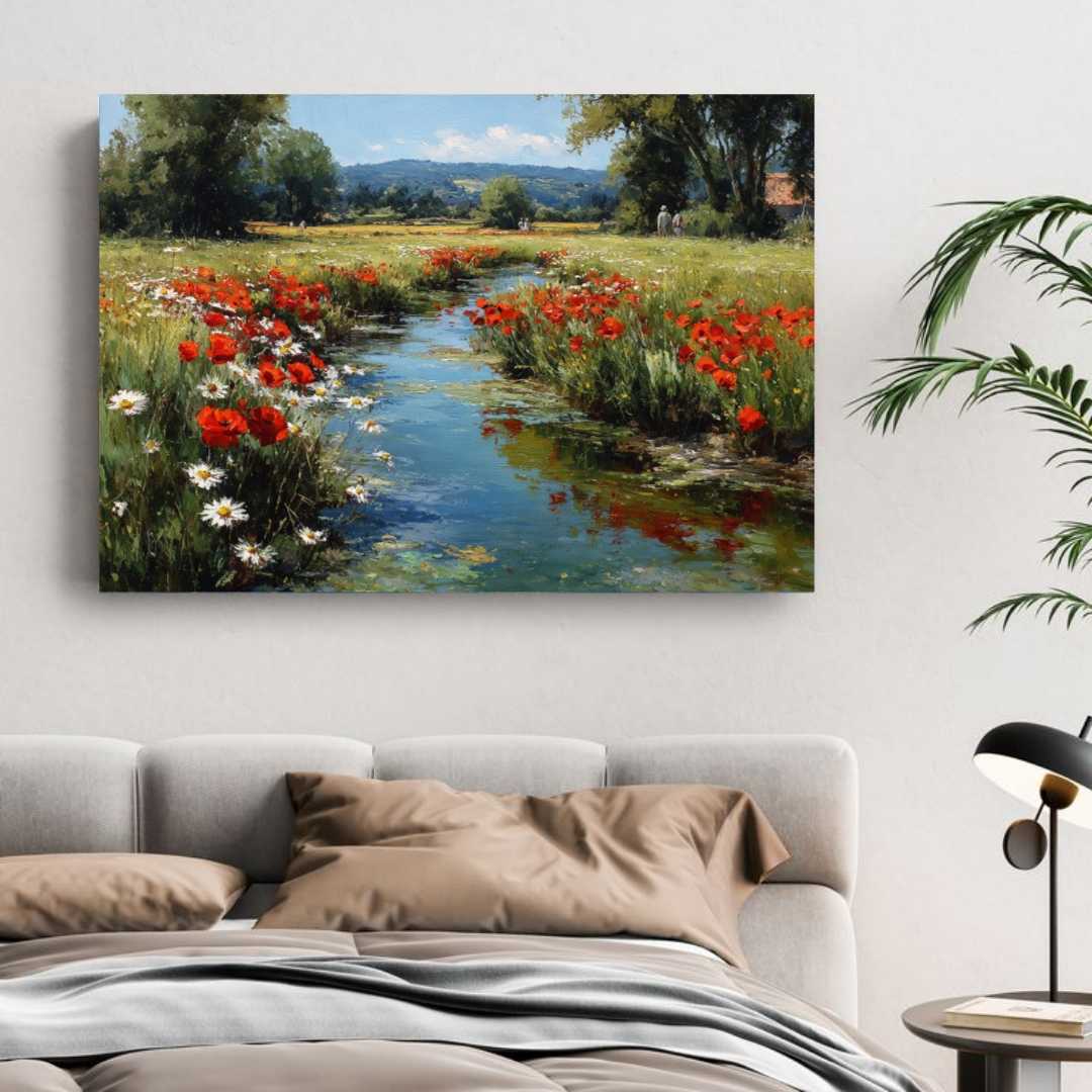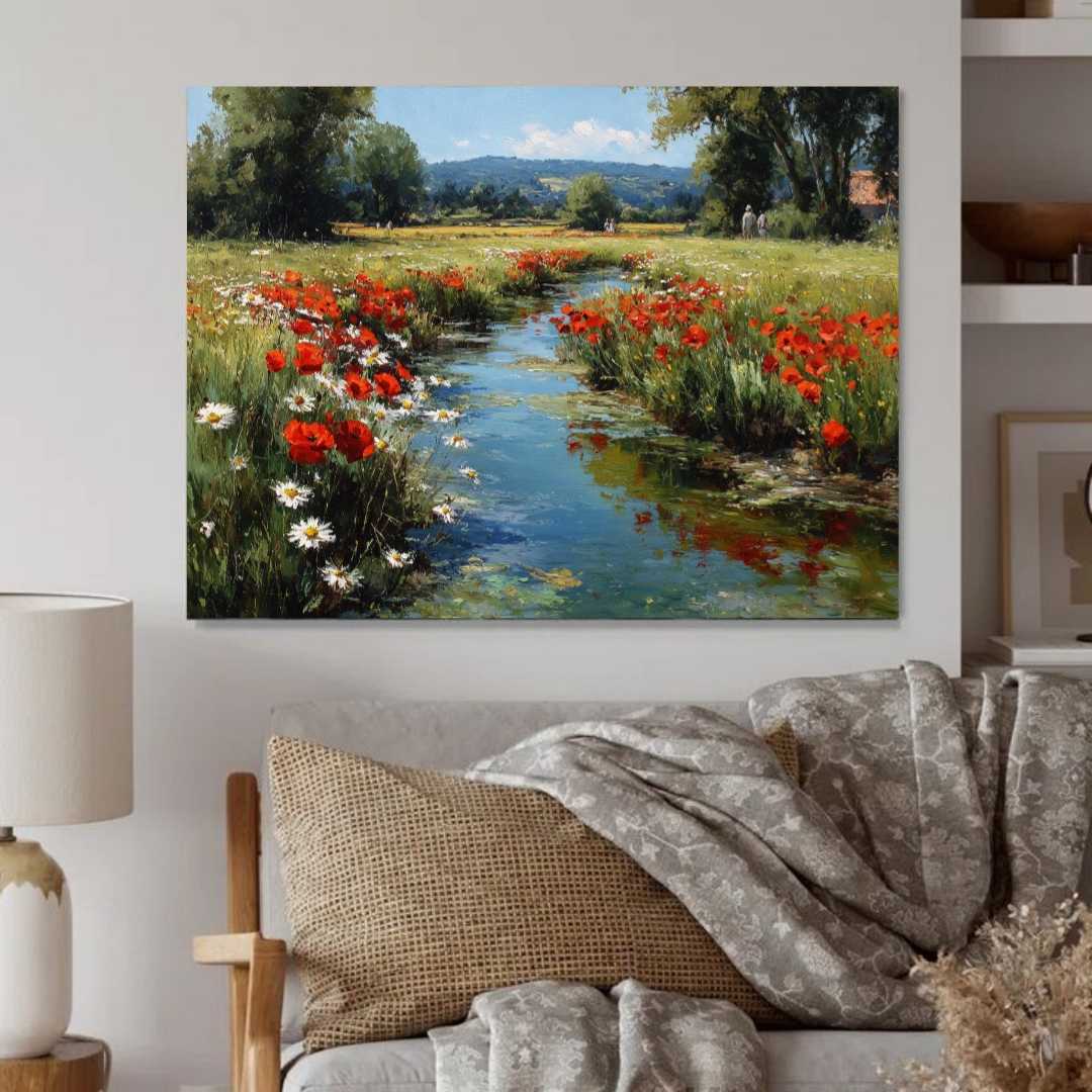 полотне запечатлен живописный пейзаж с мягким ручьем, струящимся через залитое солнцем поле. Вокруг — буйство красных маков и белых маргариток, создающих теплую и радугу красок атмосферу. Эта картина передает ощущение спокойствия, красоты и единения с природой. Идеально подойдет для тех, кто ценит гармонию природы и любит уютные, живые интерьеры