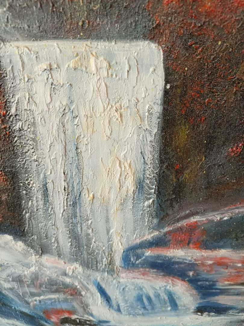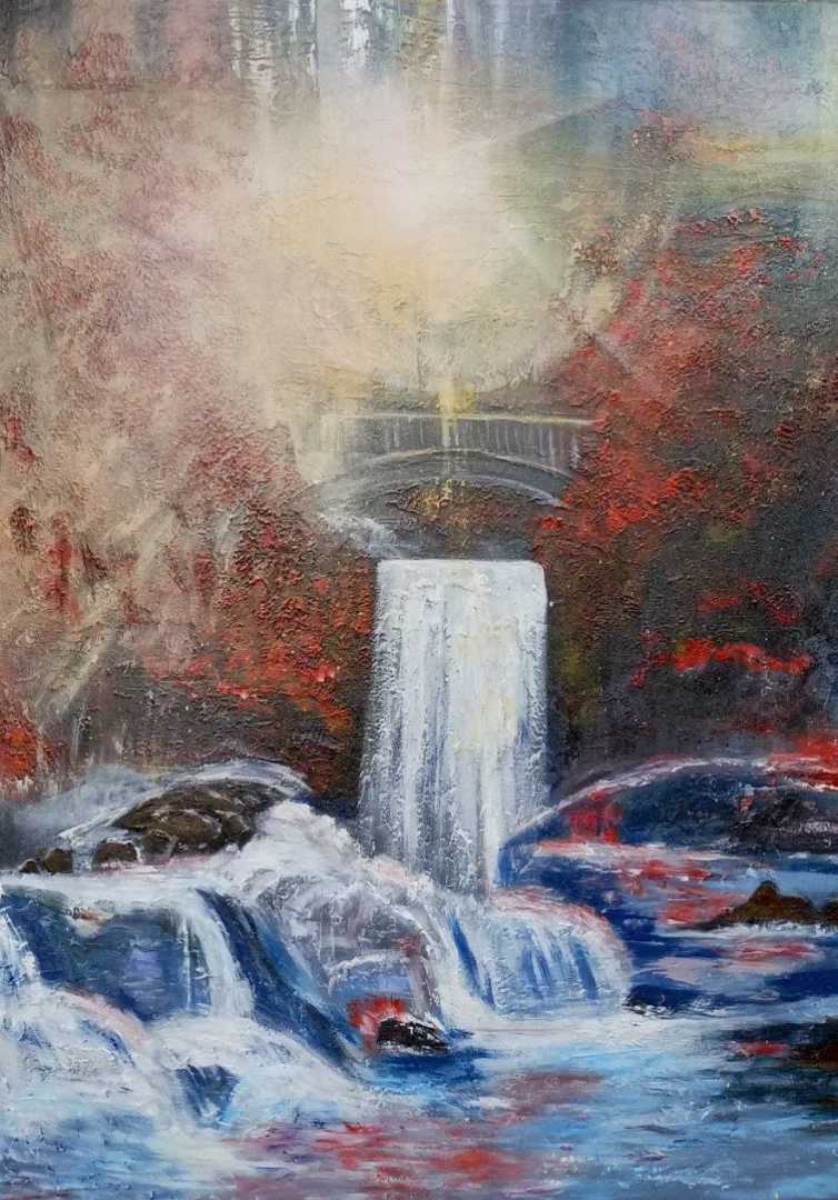 Абстрактный Солнечный осенний пейзаж, в бурном водопаде уже видны яркие листья, легкая грусть уходящего лета не портит настроения, а лишь служит напоминанием о прекрасных днях лета.