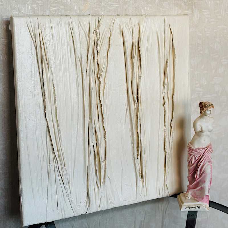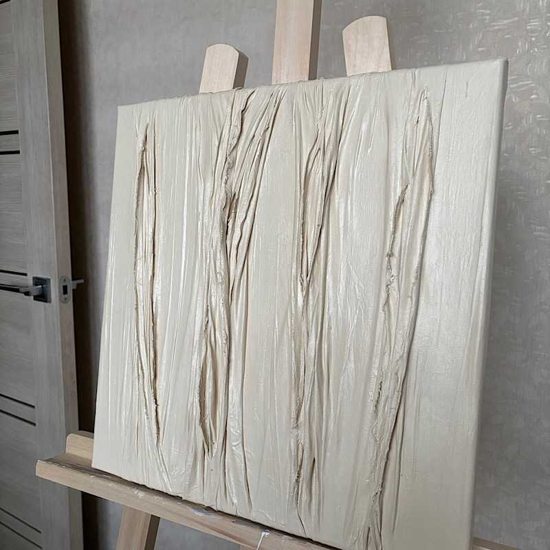 Картина выполнена на холсте из ткани, текстурной пасты и акрила. Вдохновением для создания этого произведения послужили линии судьбы на руке. У разных людей они похожи, но есть и отличия. Получилось очень живое, натуральное произведение в стиле минимализм. Фактура придает изюминку картине в целом.