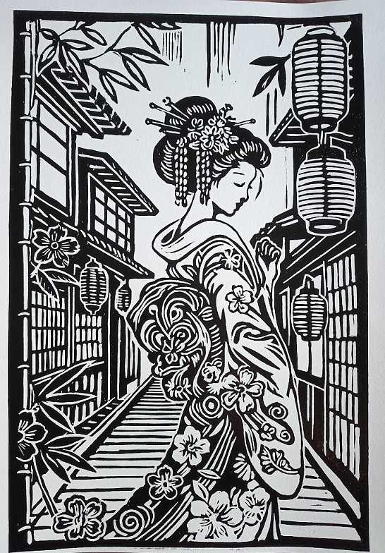 Изящная авторская линогравюра, вдохновлённая эстетикой японской культуры. Образ гейши, погружённой в тихий вечерний момент, передаёт атмосферу гармонии, уединения и внутреннего покоя.