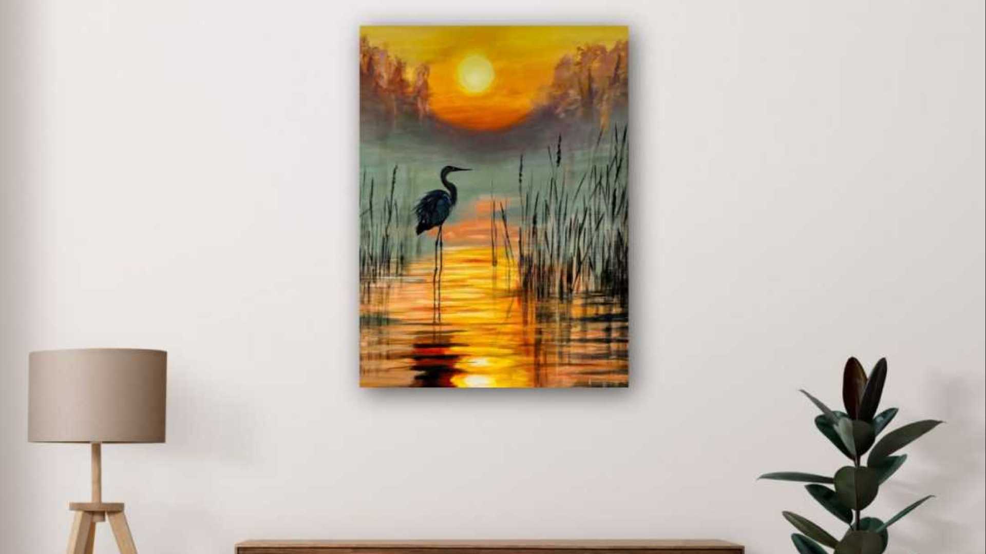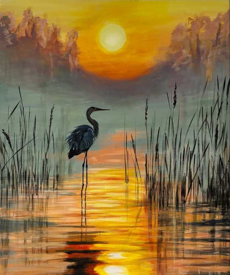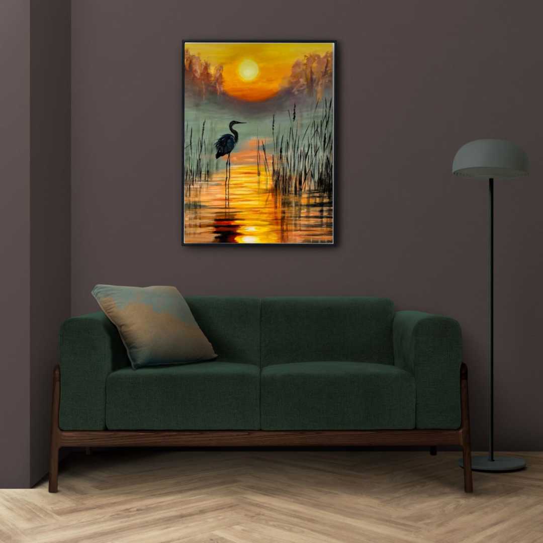 Закат, застывший в краске. Оранжево-золотое солнце над водой, отражающееся в ряби, силуэт цапли среди камышей — картина создаёт ощущение глубокого спокойствия и умиротворения. Тёплые тона неба, холодные оттенки воды и чёрный силуэт
