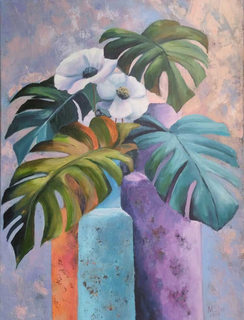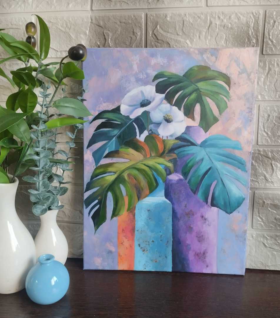 Центром композиции стали пышные листья монстеры, обрамляющие нежные белые анемоны. Яркие вазы в пастельных оттенках — оранжевом, голубом и фиолетовом — создают выразительный контраст с сочной зеленью и чистотой цветов.