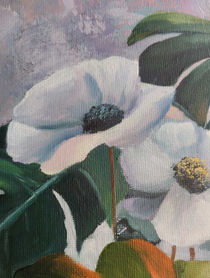 Картина сочетает в себе элементы ботанического натюрморта и декоративного и