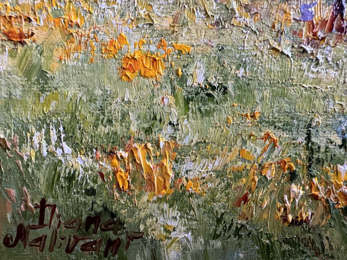 "Что касается пейзажей кисти Дианы Маливани, то влияние Теодора Руссо и французских живописцев-реалистов девятнадцатого века особенно хорошо прослеживается в блистающей массе различных цветов, используемых художником при изображении небосвода. Нежные оттенки розового, голубого и оранжевого разливают