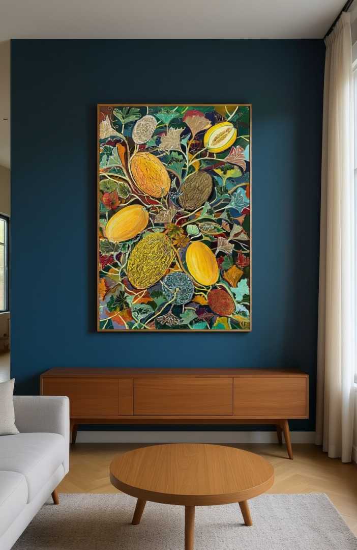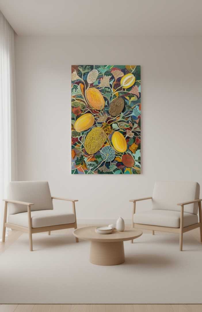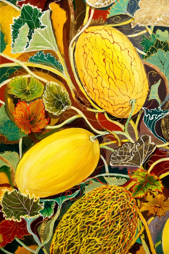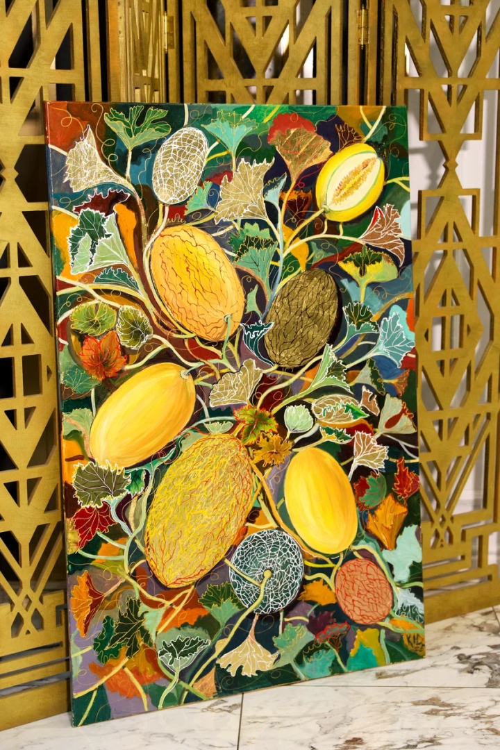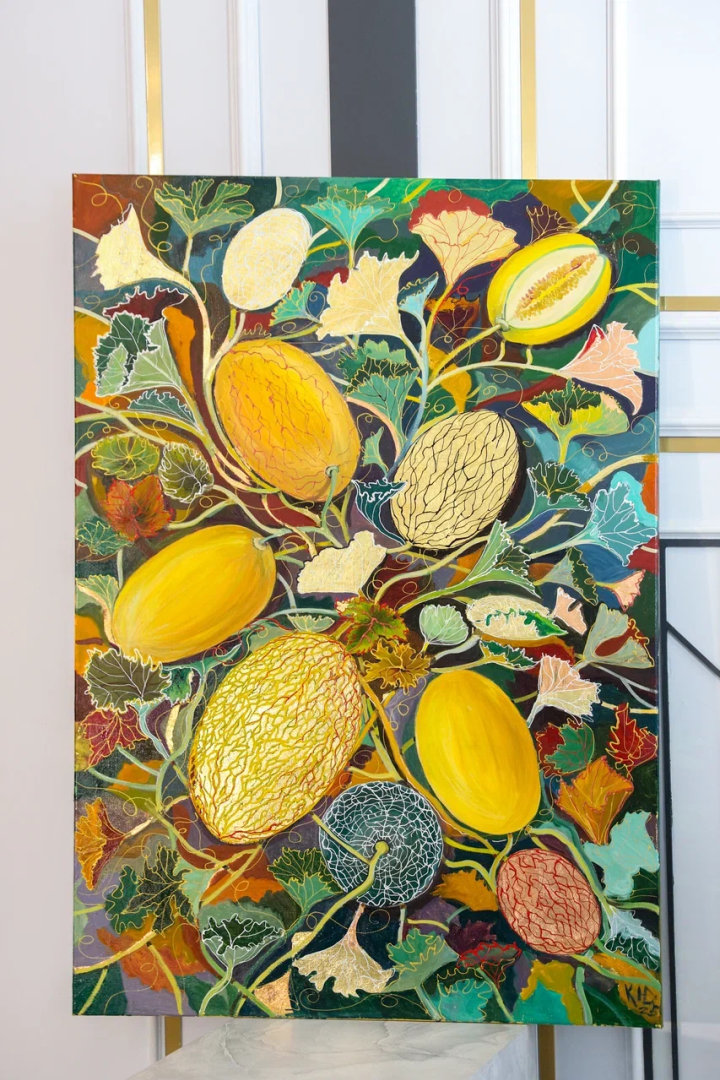 декоративное панно «Царство дыни» из серии «Райский сад». Оно выполнено на холсте размером 120x80 см и создано в 2025 году с использованием масла, акрила и золотой потали. ✨
