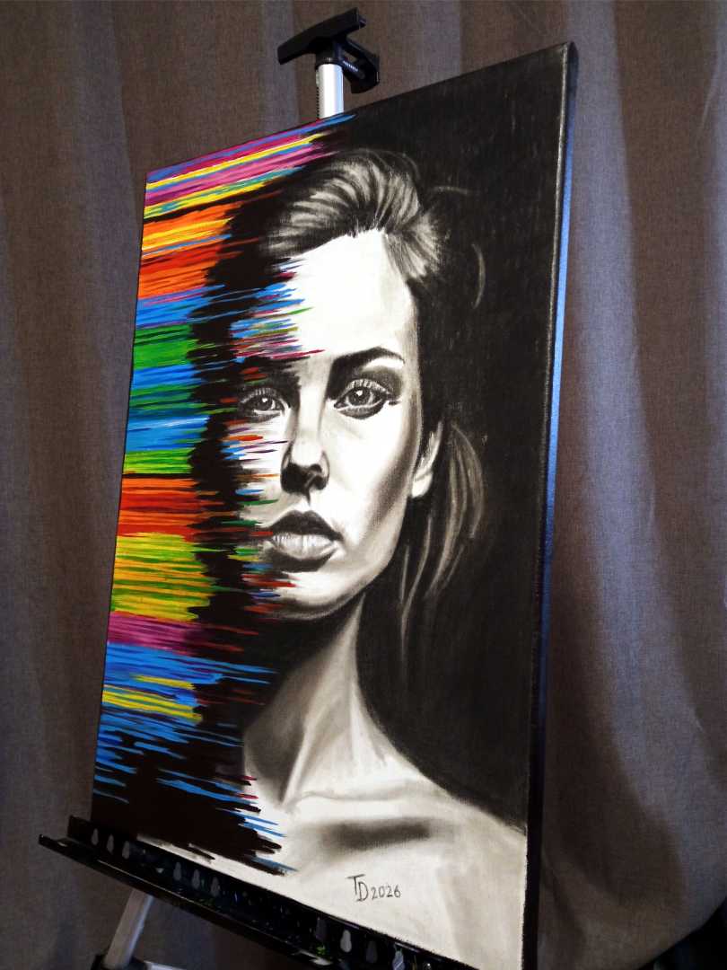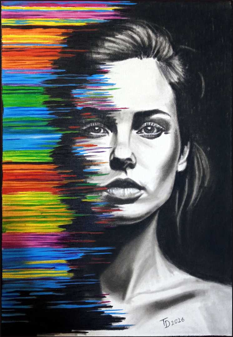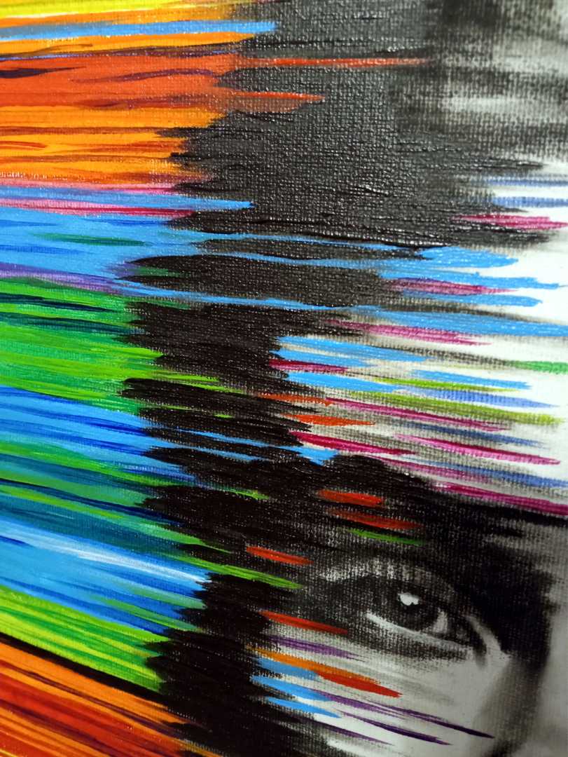 Эта работа о растворении человеческой индивидуальности в цифровым мире и информационным шуме. Картина объединяет в себе графику (древесный уголь) и живопись (акрил) и смешивает абстракцию с реализмом.