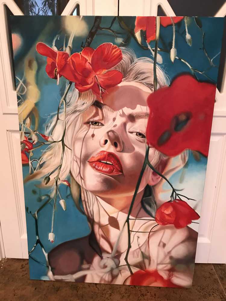 На изображении представлена картина, выполненная в стиле сюрреализма. Центральным элементом композиции является лицо женщины с выразительными чертами, окруженное красными цветами, которые создают контраст с её светлыми волосами. Цветы, кажется, растут прямо из её лица, что придает работе символическ