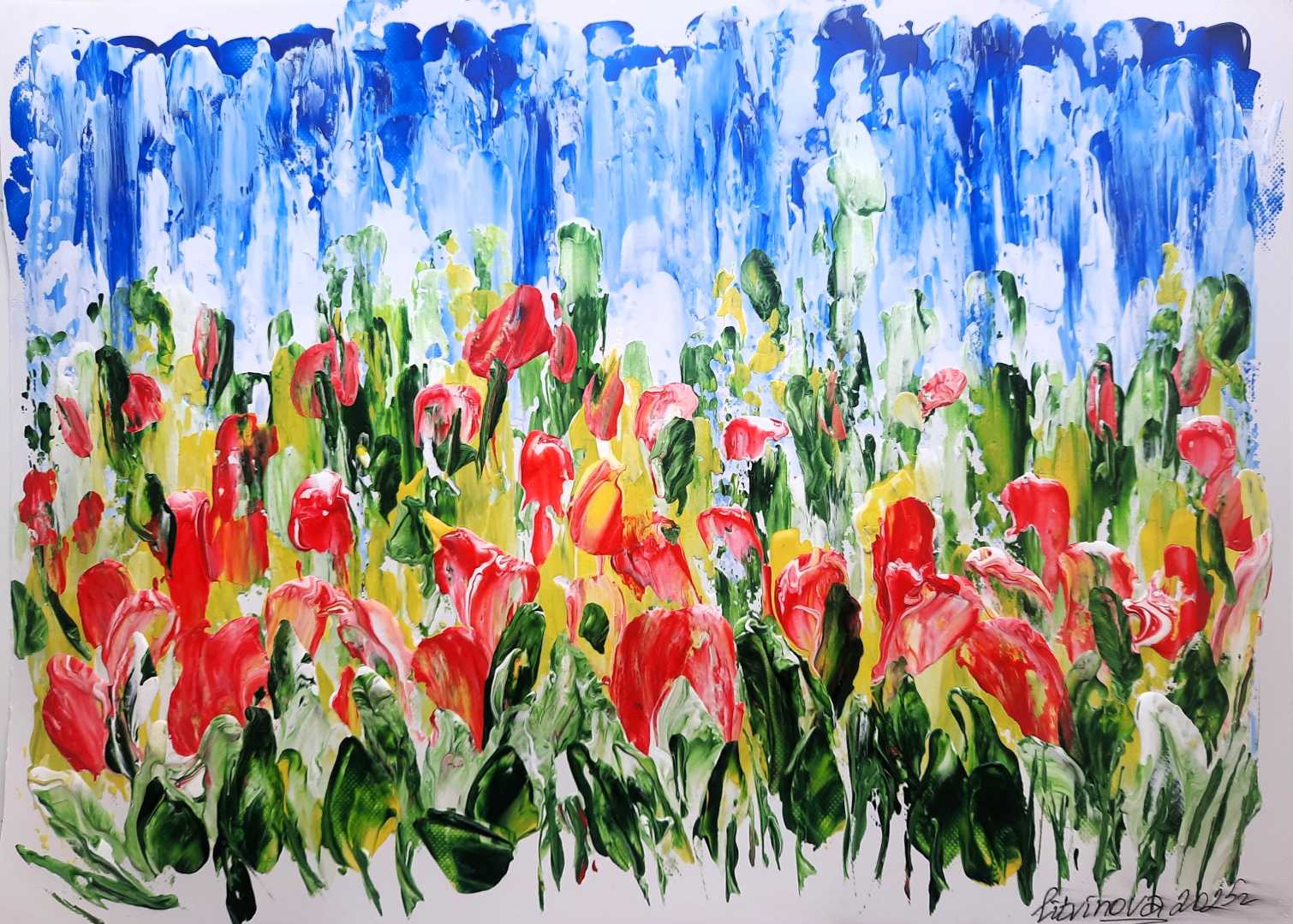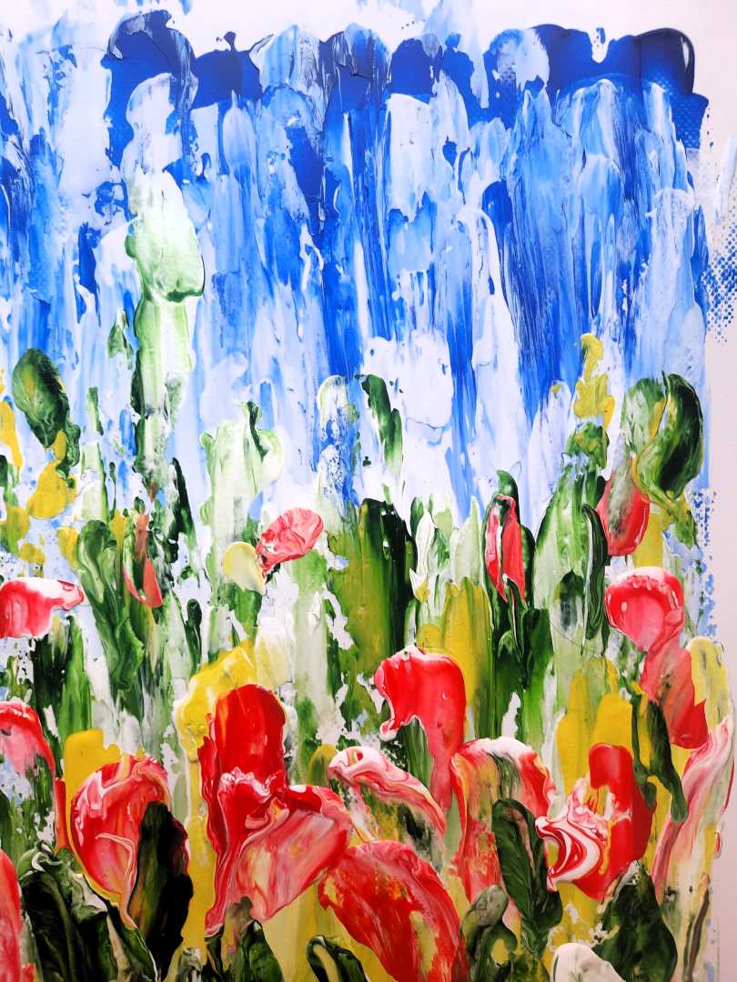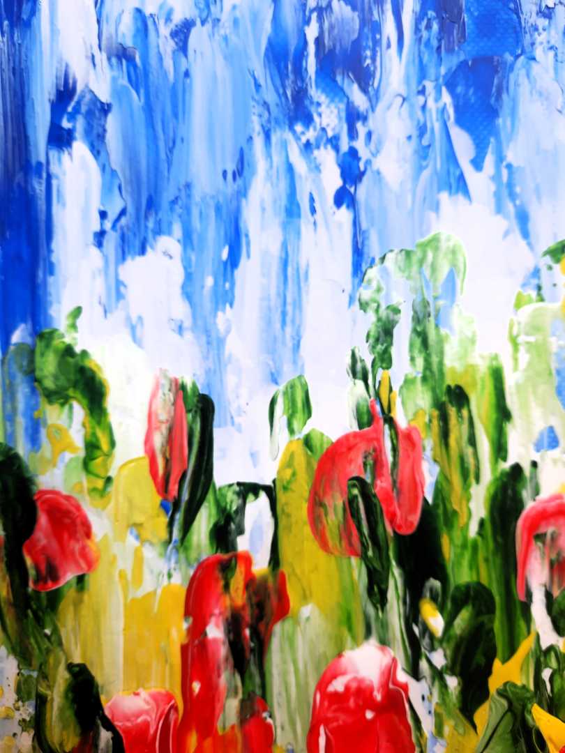 Это произведение выполнено техникой мастихина на специальной бумаге с текстурой холста. Автор использовал разводы и плавные переходы цвета, создавая абстрактное изображение цветочного поля с кустарниками и цветами. Работа 2025 года и выделяется живой цветовой палитрой, где характерно присутствие отт