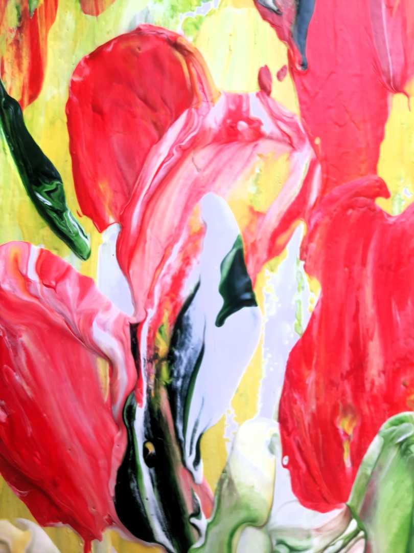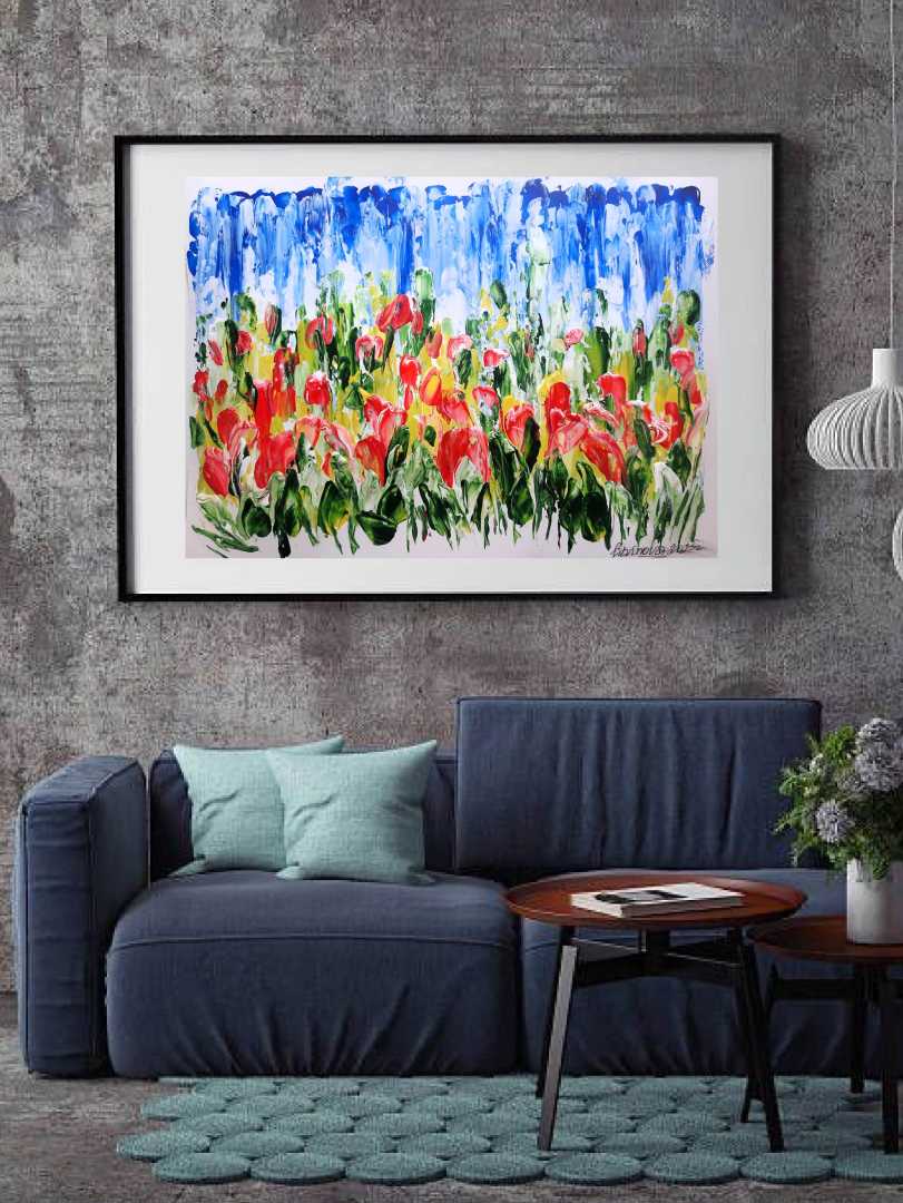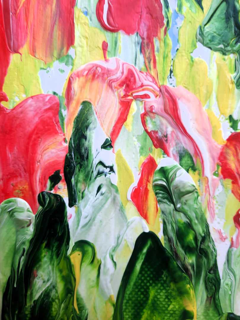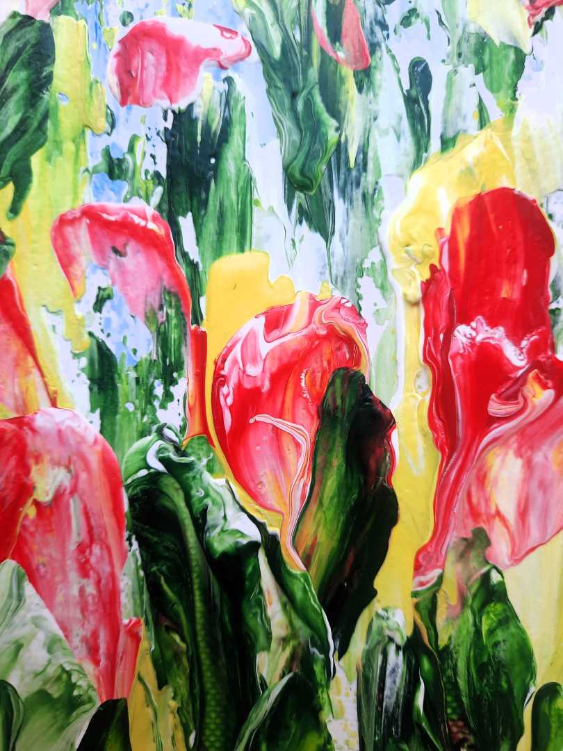 Это произведение выполнено техникой мастихина на специальной бумаге с текстурой холста. Автор использовал разводы и плавные переходы цвета, создавая абстрактное изображение цветочного поля с кустарниками и цветами. Работа 2025 года и выделяется живой цветовой палитрой, где характерно присутствие отт