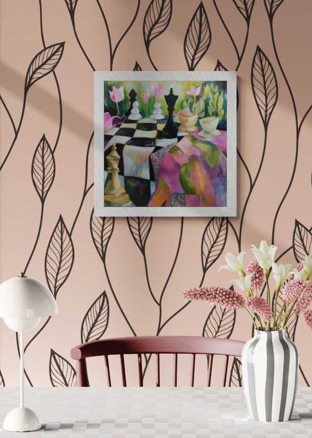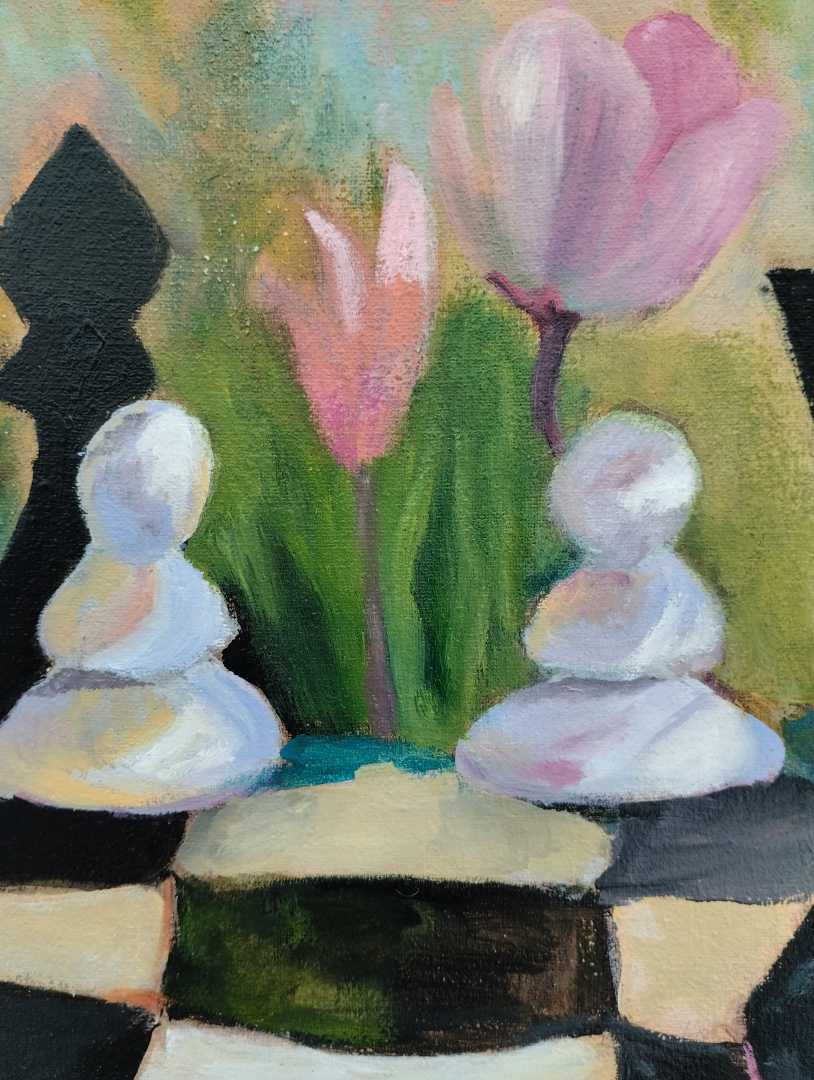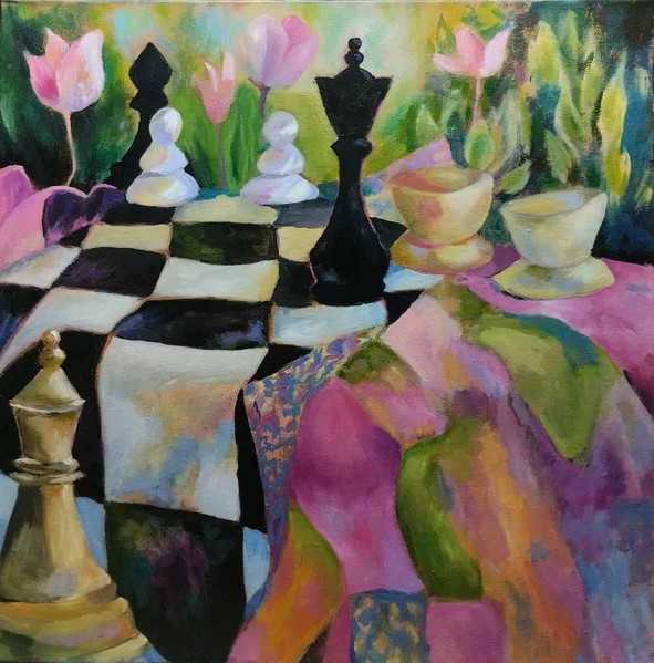 На полотне переплетаются два мира — строгий порядок шахматной доски и буйство красок цветущего сада. В центре композиции — шахматные фигуры (короли и пешки), застывшие в напряжённом противостоянии. Их строгие силуэты контрастируют с нежными розовыми тюльпанами на заднем плане, создавая уника