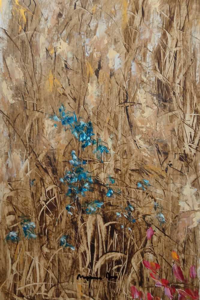 Картина «Уголок осени» передает тихую красоту увядающей природы осенью. Тёплые охристые соединения травяного контраста с яркими акцентами голубых и красных цветочков создают живой и глубокий образ осеннего пейзажа. Свободная фактурная живопись создает ощущение естественности и движения ветра среди т