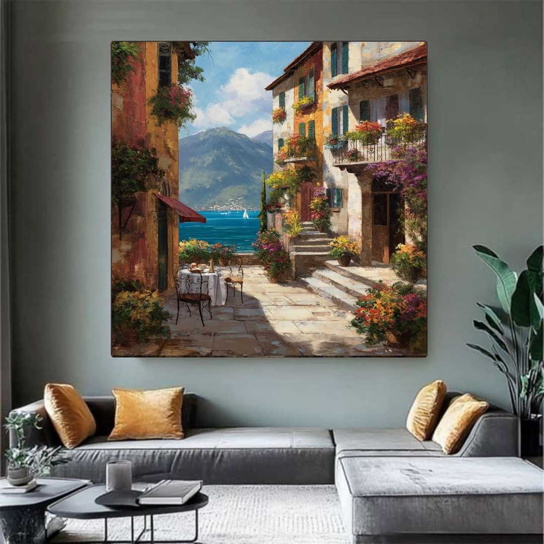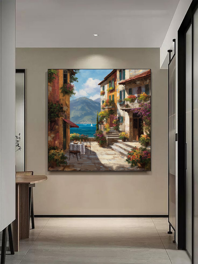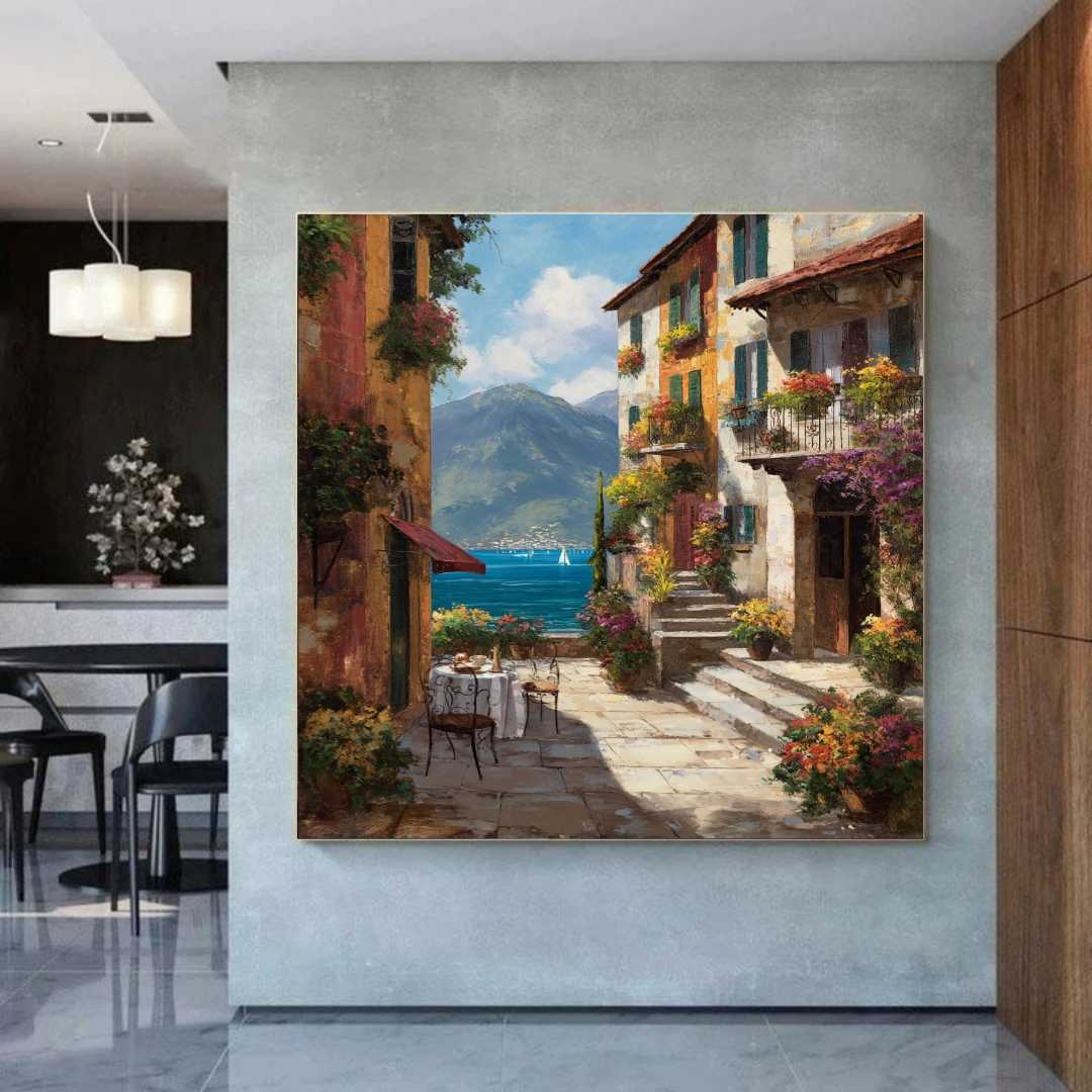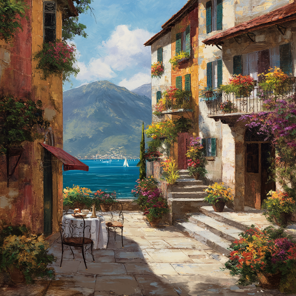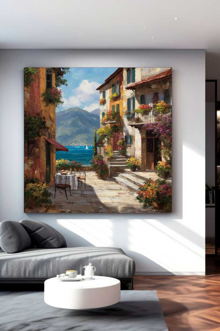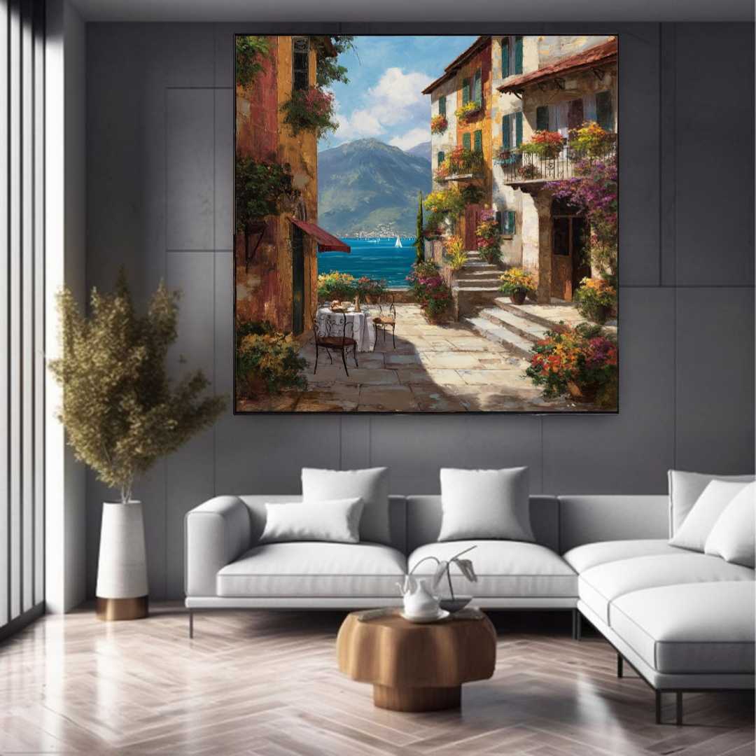 картиной маслом. На холсте запечатлена живописная улица в уютном приморском городе, украшенная яркими цветами и старинными домами, а вдалеке раскинулось синее море с лодками — символ спокойствия и свободы. Мягкое солнце, цветущие балконы и аромат моря создают ощущение тепла и роскоши, напоминая о романтике итальянских улиц и морских приключениях.