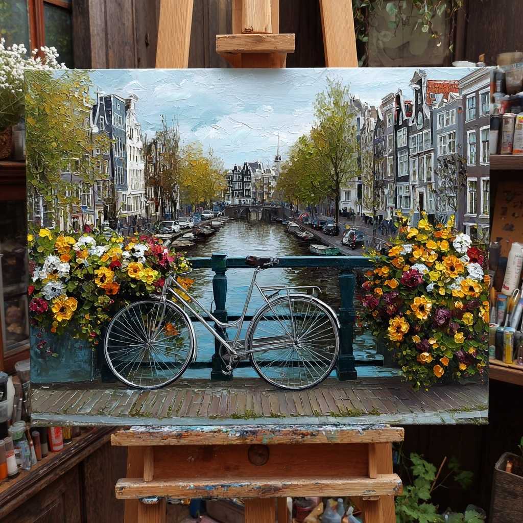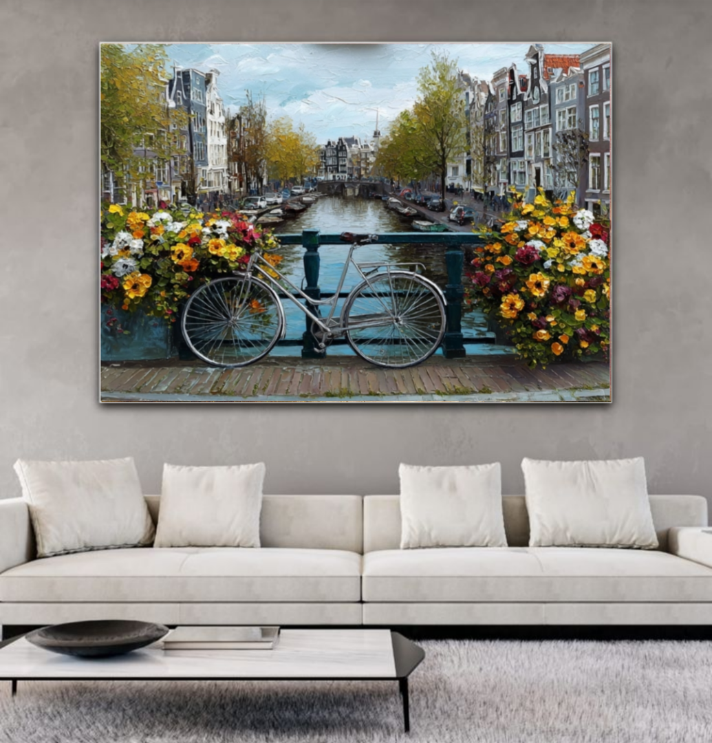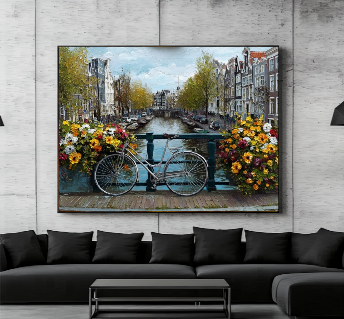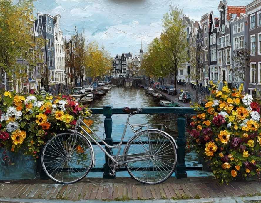 щная картина перенесет вас в атмосферу европейского уюта и красоты. На переднем плане — стильный велосипед, припаркованный на мосту, украшенном яркими цветами, создающими романтичную и живую атмосферу. Виден живописный канал, а окружение наполняет работу теплом и очарованием старинных городов.