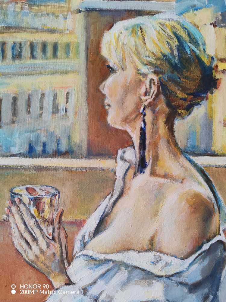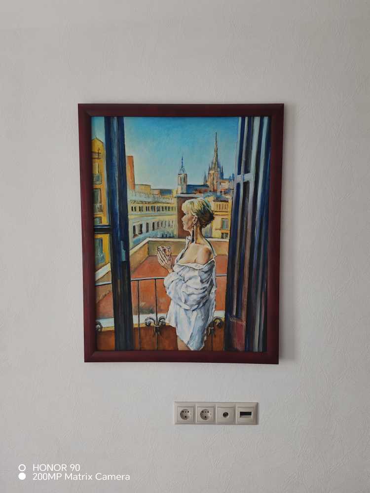 Картина «Утро в Барселоне» передаёт атмосферу спокойного начала дня в европейском городе. Женский образ на балконе, мягкий утренний свет и архитектурный пейзаж создают ощущение тишины, уюта и созерцательности. Работа наполнена светом и воздухом, сочетая городской ритм и личное пространство, и станет